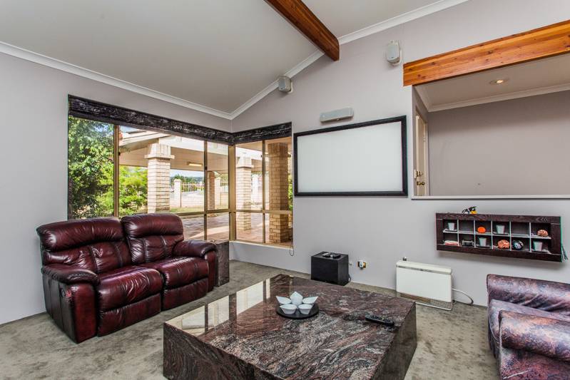 The Entrance Hall opens into the Lounge/Home Theatre Room with high ceilings, feature lighting, overhead projector and the Dining area which is currently used as a Study.