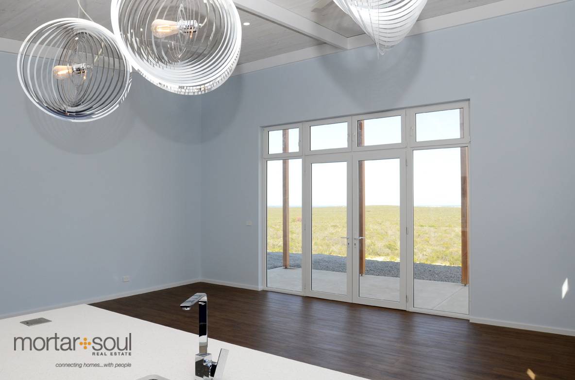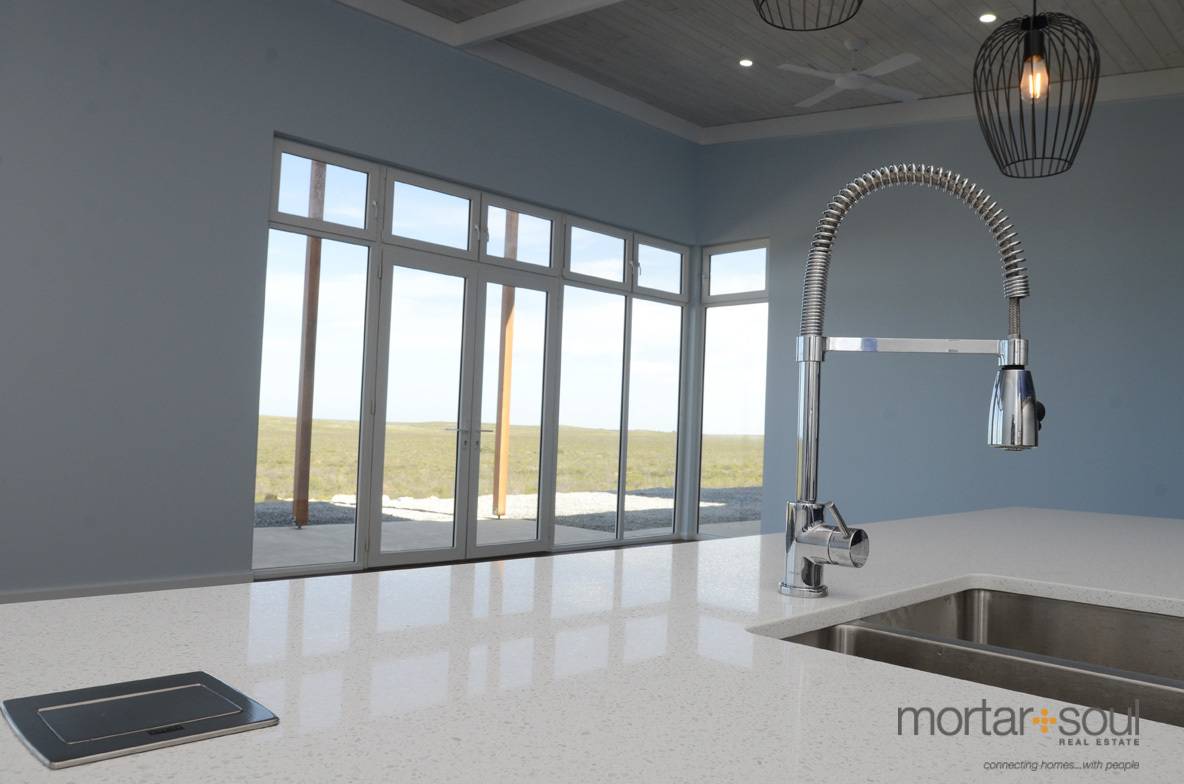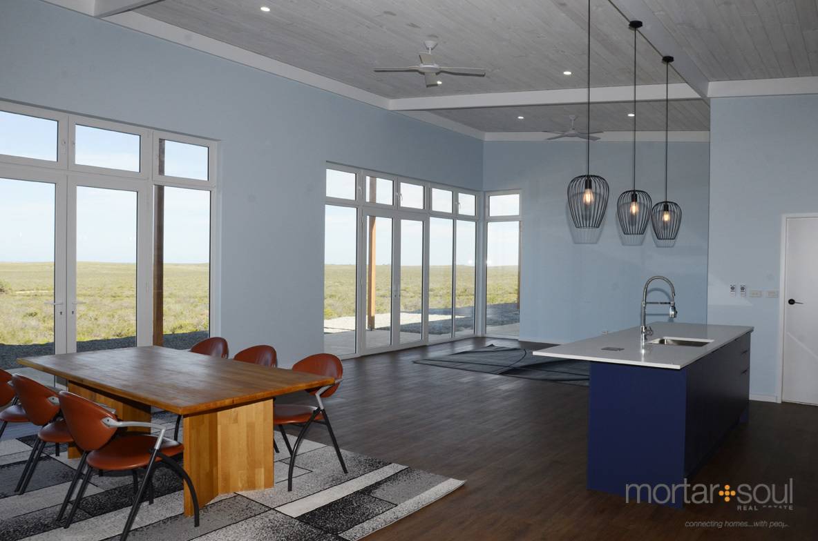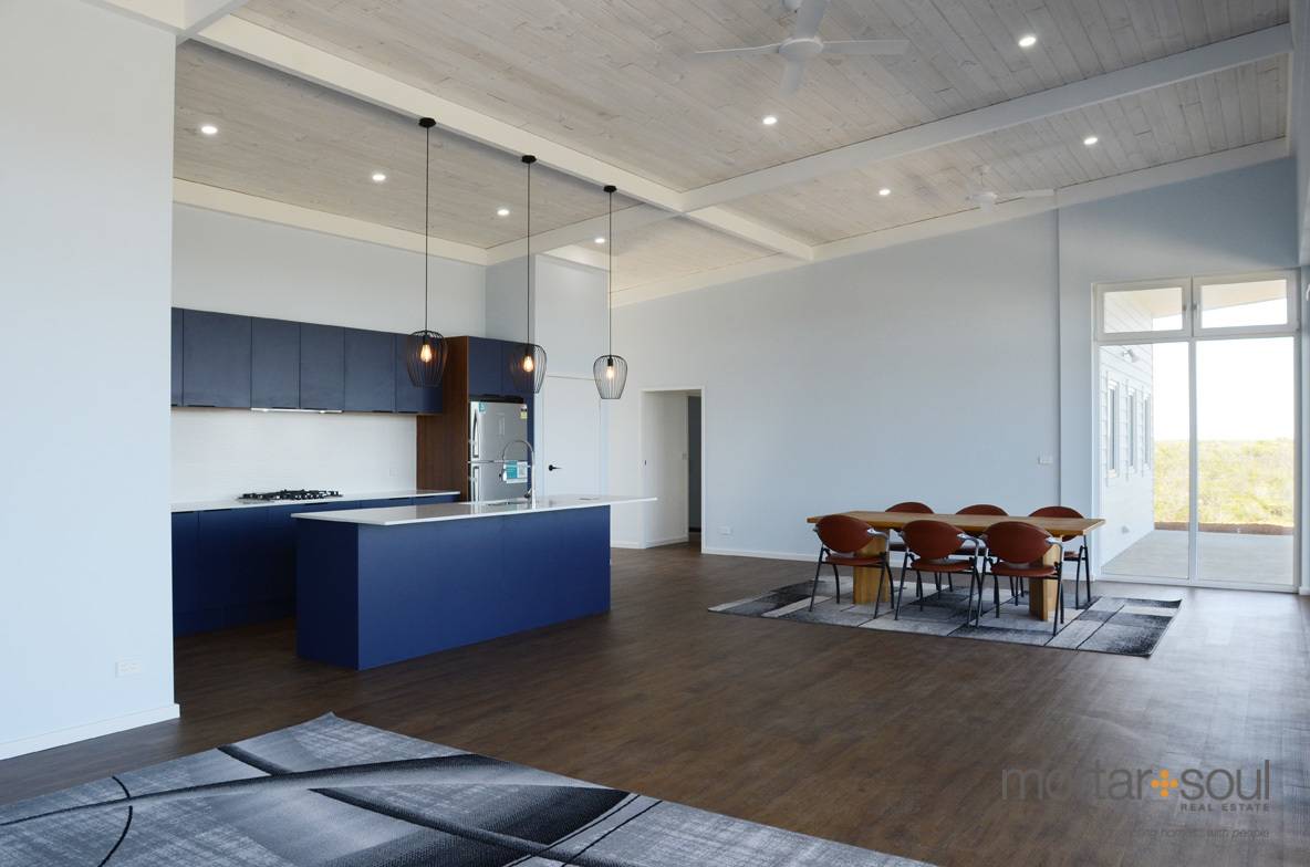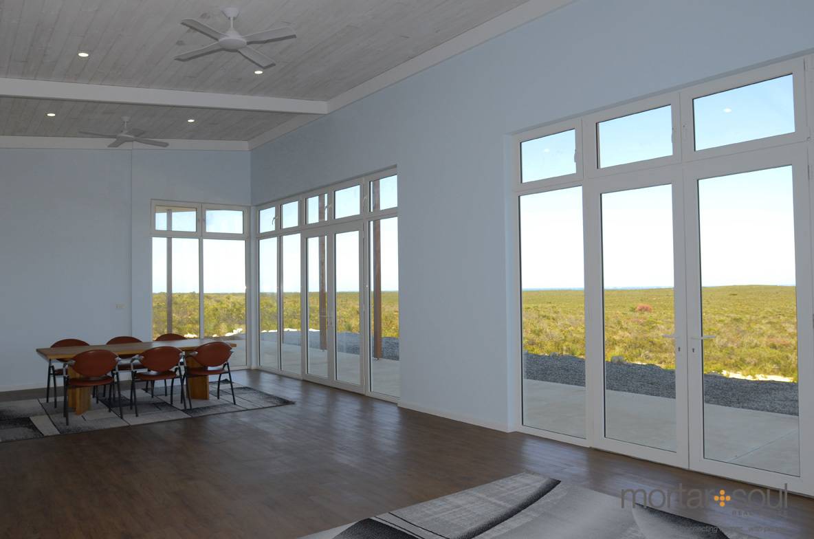 On entry to the main residence, you are greeted by the open plan kitchen, dining and family area with a 2 storey raked ceiling offering superior air flow when combined with the double glazed, double locking French doors to both sides of the living area. Once you have taken in the sheer bold simplicity of the living area’s design, you are then moving out onto the patio area and picture perfect vista across natural bush to Jurien Bay and the Indian Ocean.