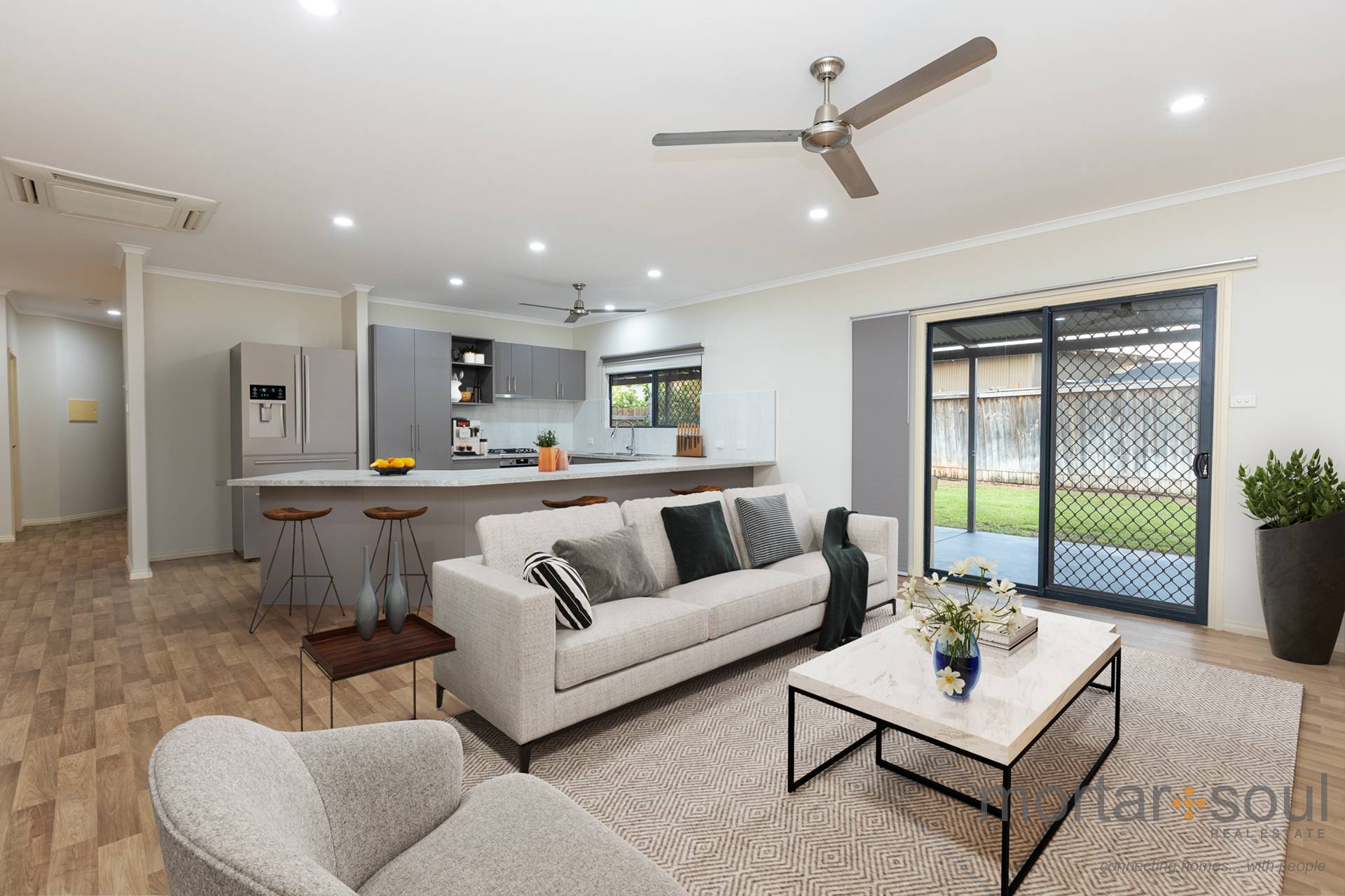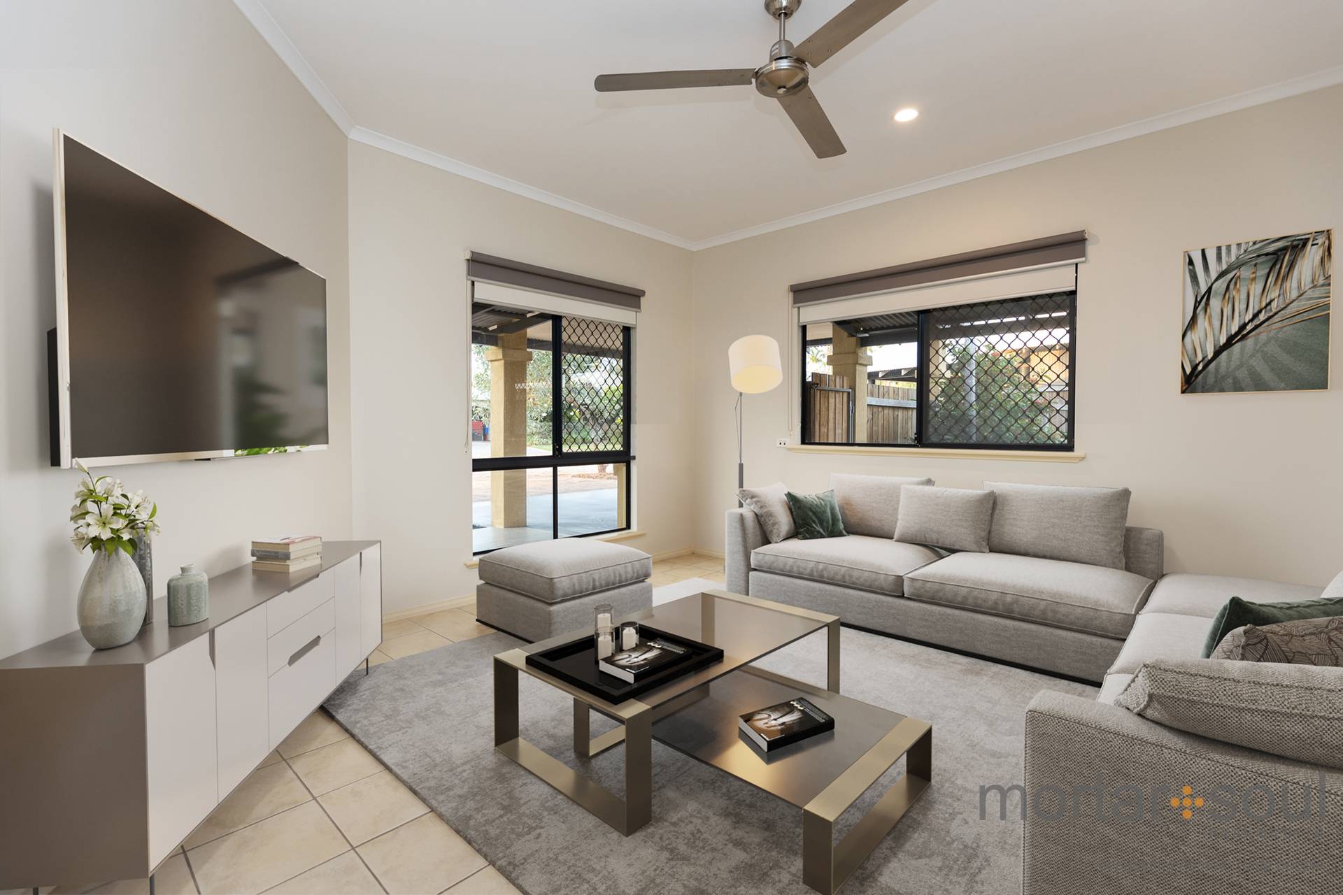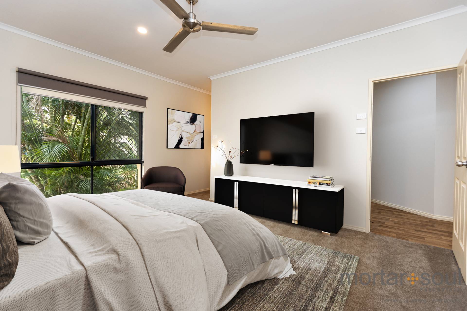 The main living zone seamlessly extends outdoors to a lengthy entertaining verandah that wraps around to the back of the house and is more than generous in its proportions. It splendidly overlooks a sprawling yard, the swaying palm trees and pleasant leafy gardens.