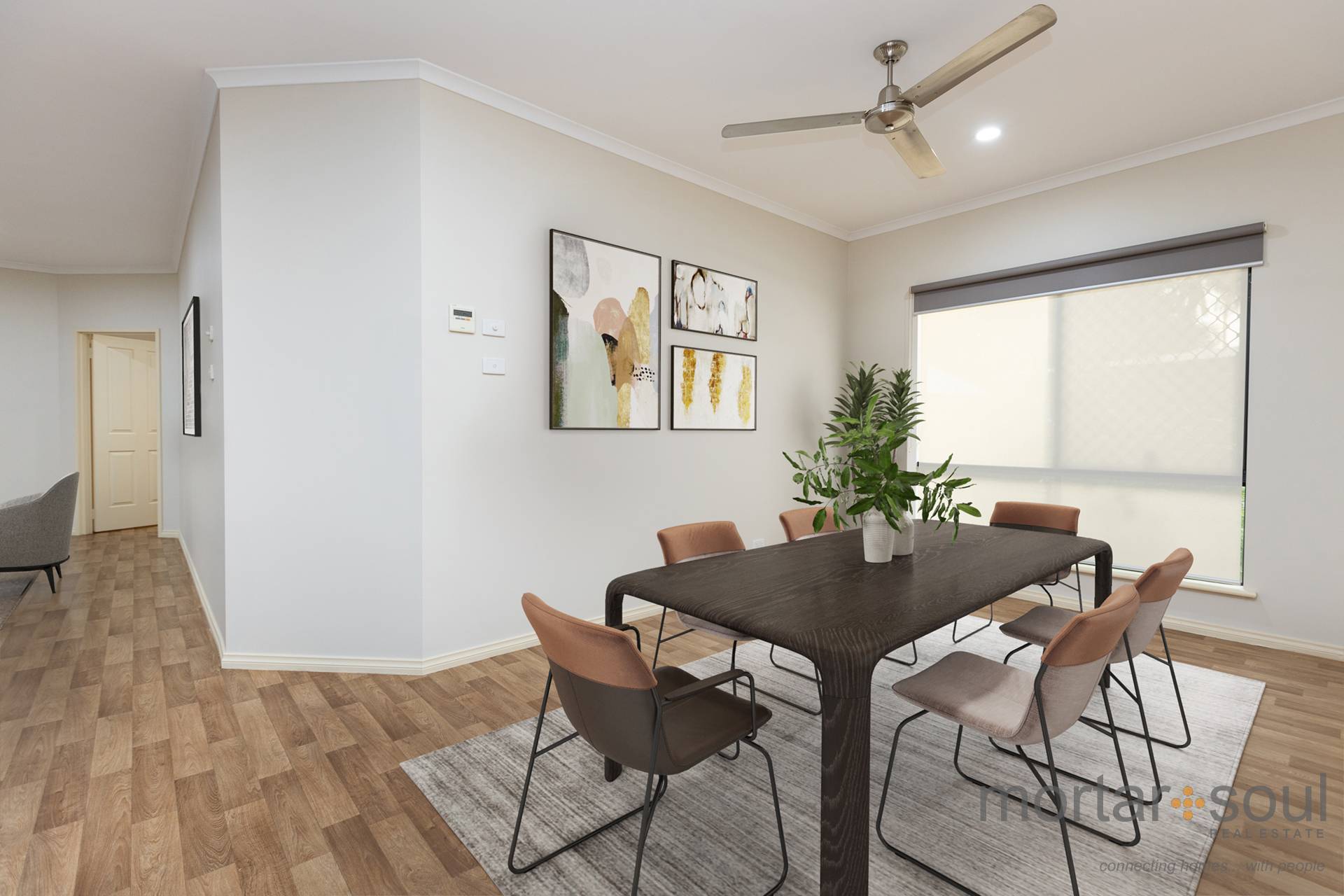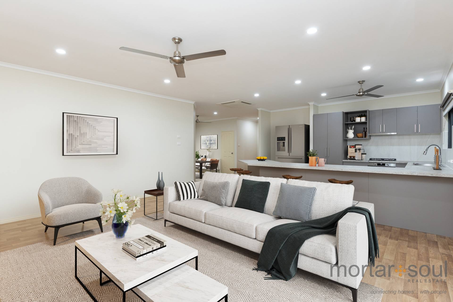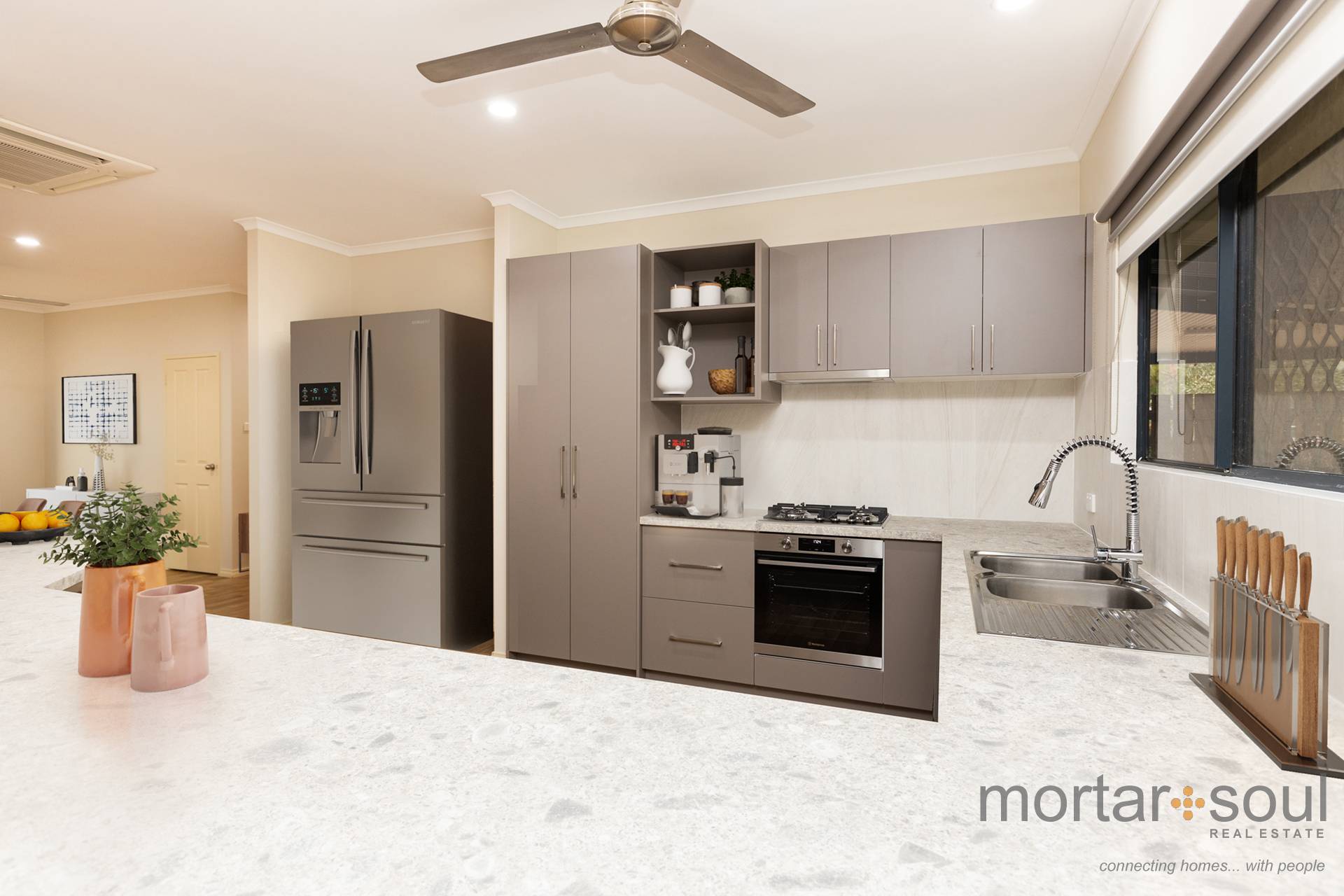 Off the entry verandah lies a formal front lounge room, right next to a spacious master-bedroom suite with air-conditioning, a walk-in wardrobe and a private ensuite bathroom – shower, vanity, toilet and all. A central dining area next to the kitchen forms part of a huge open-plan casual living space, also incorporating the aforementioned lounge.