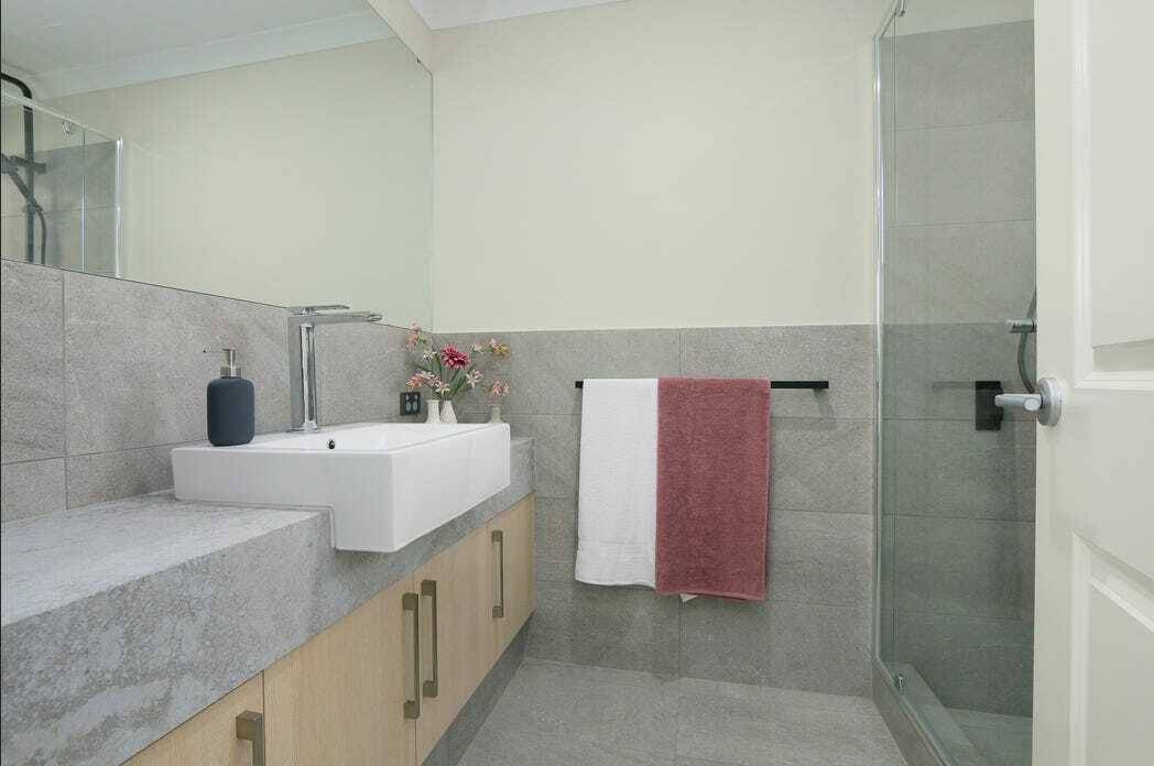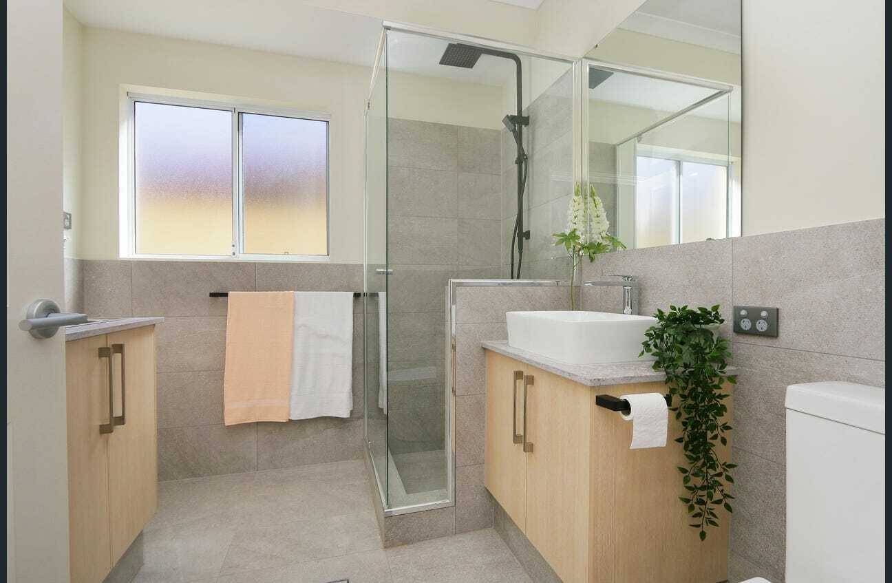 The pick of the bedrooms is a sumptuous master suite with built-in wardrobes and a private ensuite bathroom – stone vanity, rain shower, toilet and all. The sleek main bathroom-come-laundry is made up of a rain shower, a powder vanity, a separate wash trough, stone bench tops and a toilet.