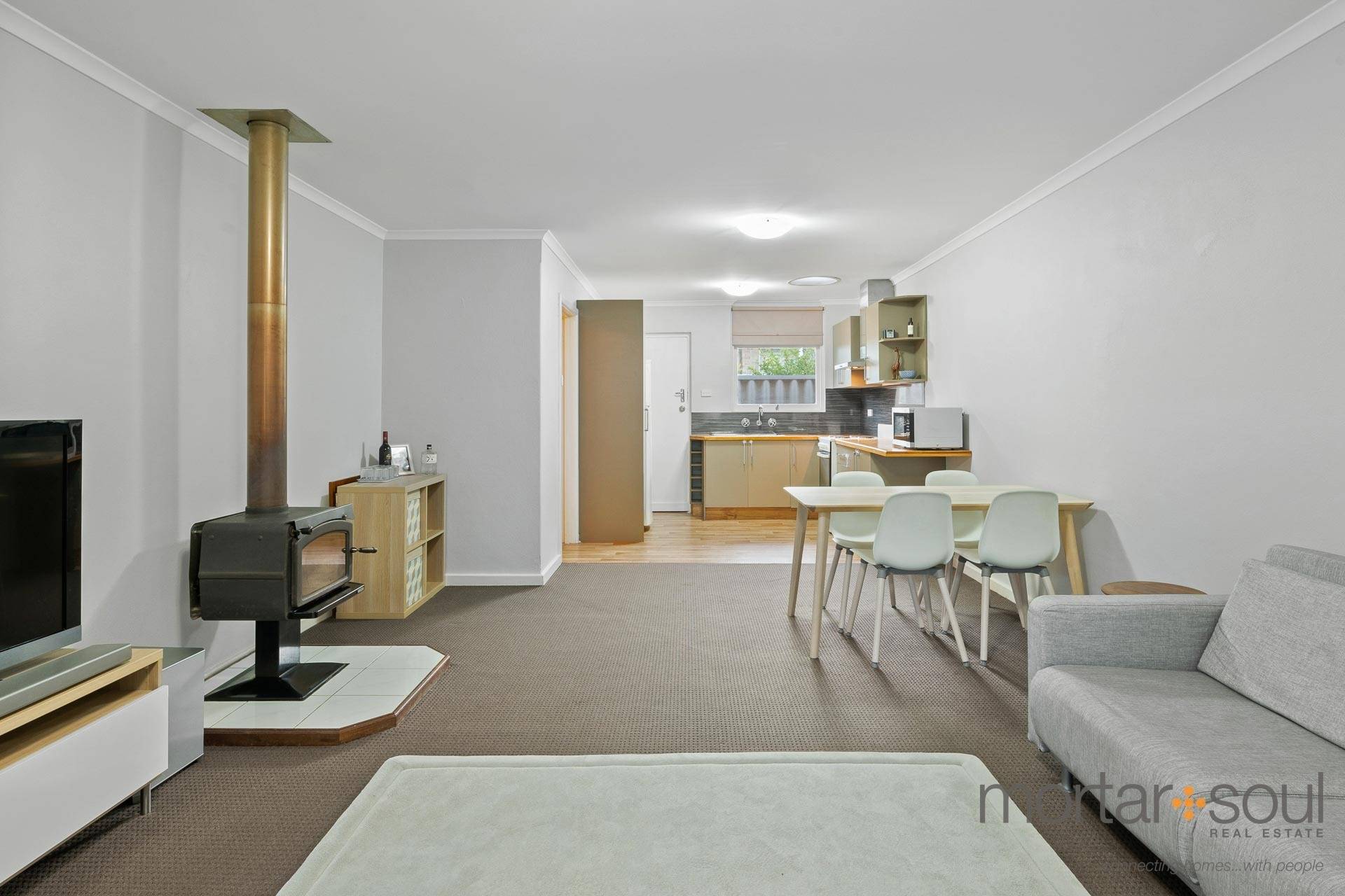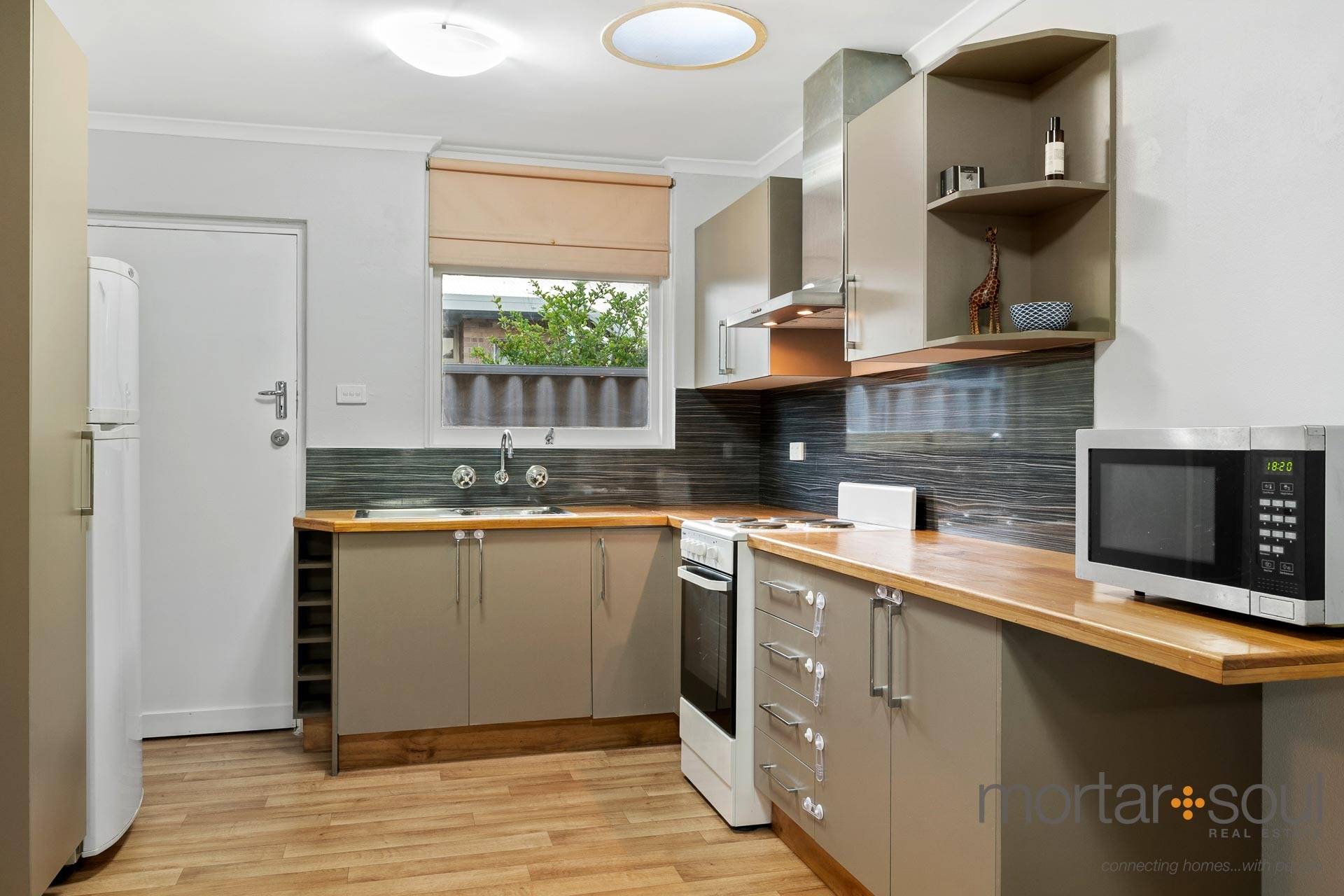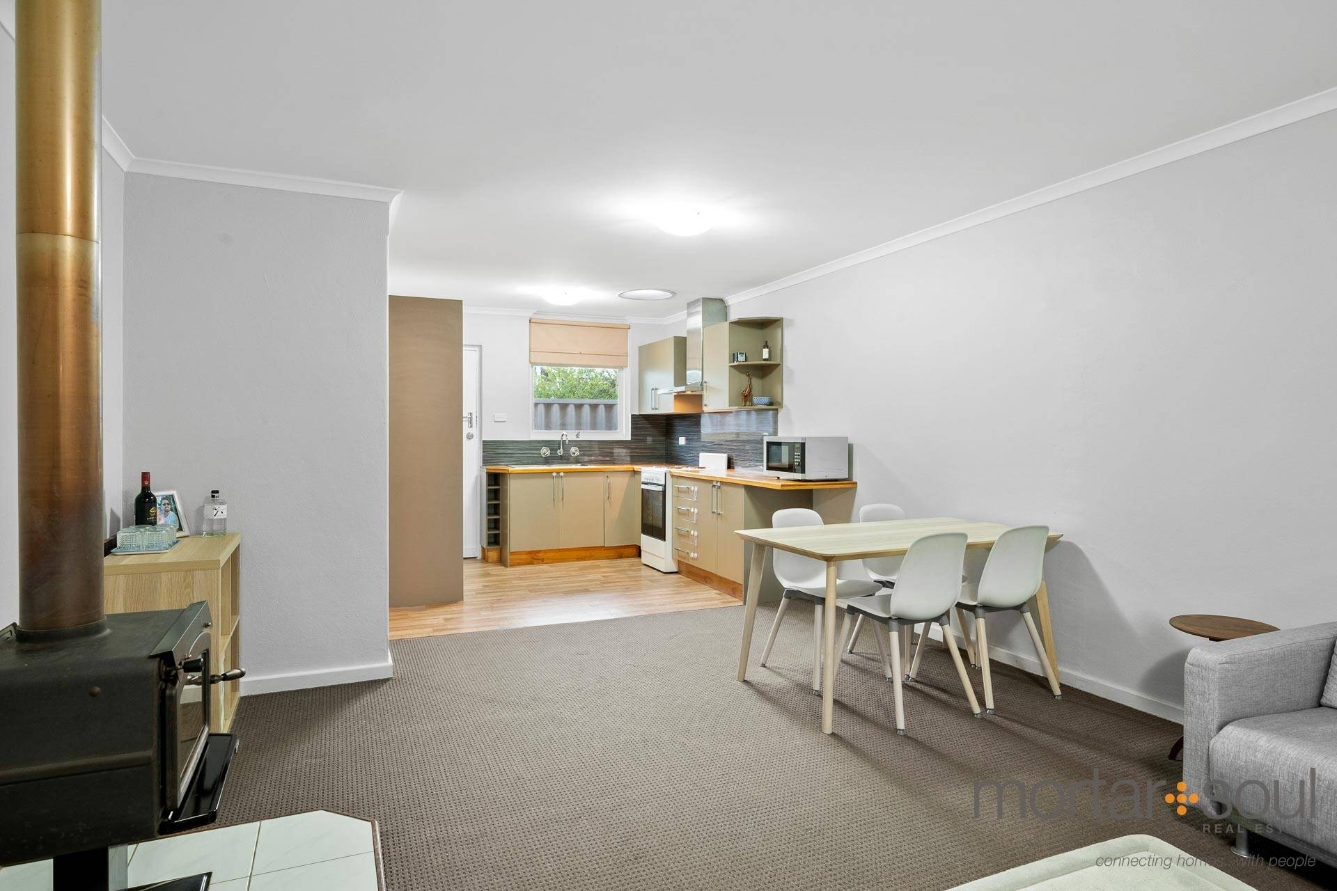 Welcoming you inside is a spacious and carpeted open-plan living and dining area, boasting a feature pot-belly wood-burner fireplace for those chilly winter months. Incorporated into the design is a charming kitchen with low-maintenance wood-look floors, timber bench tops, a stainless-steel range hood and a Chef electric-upright cooker.