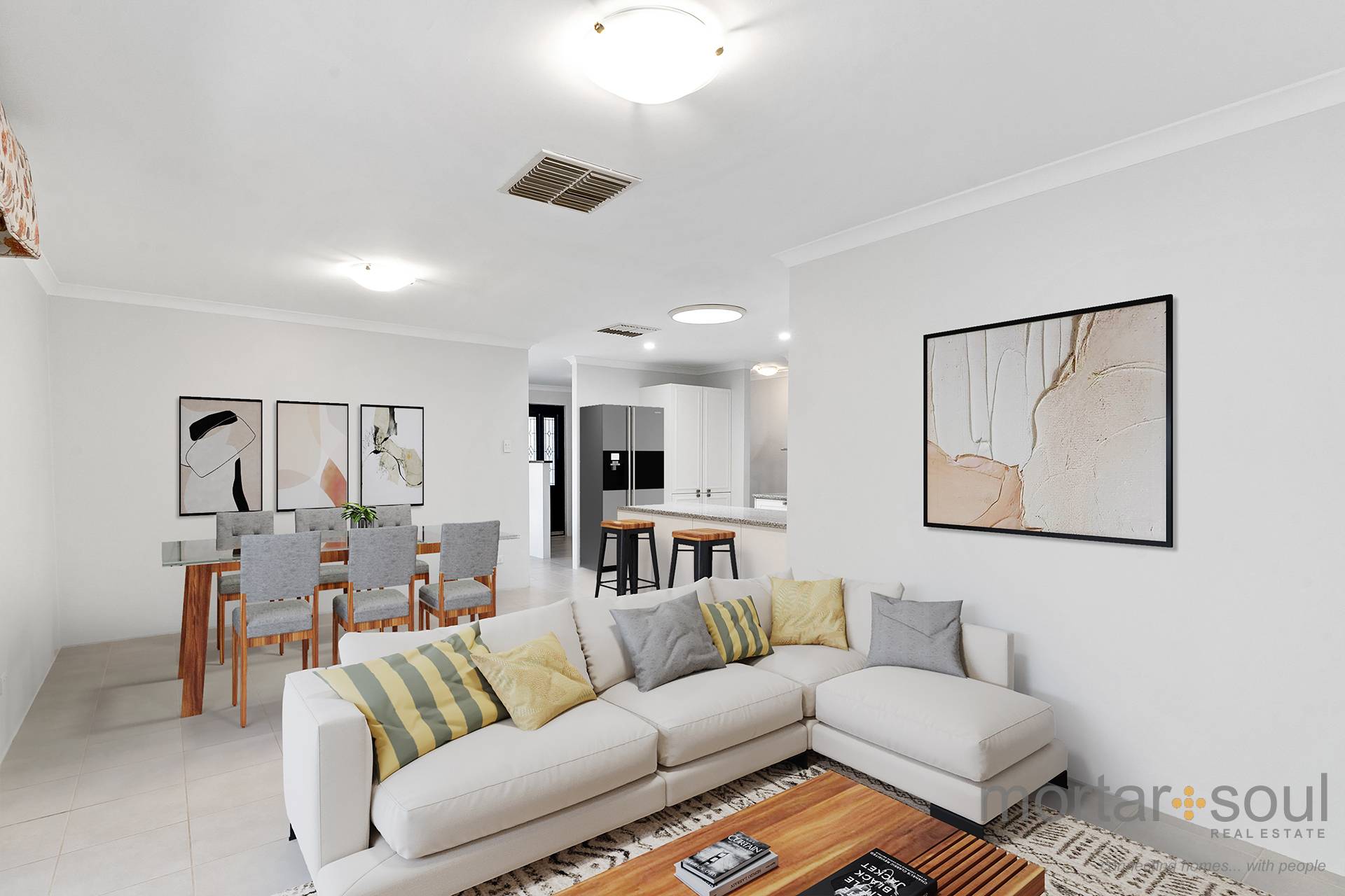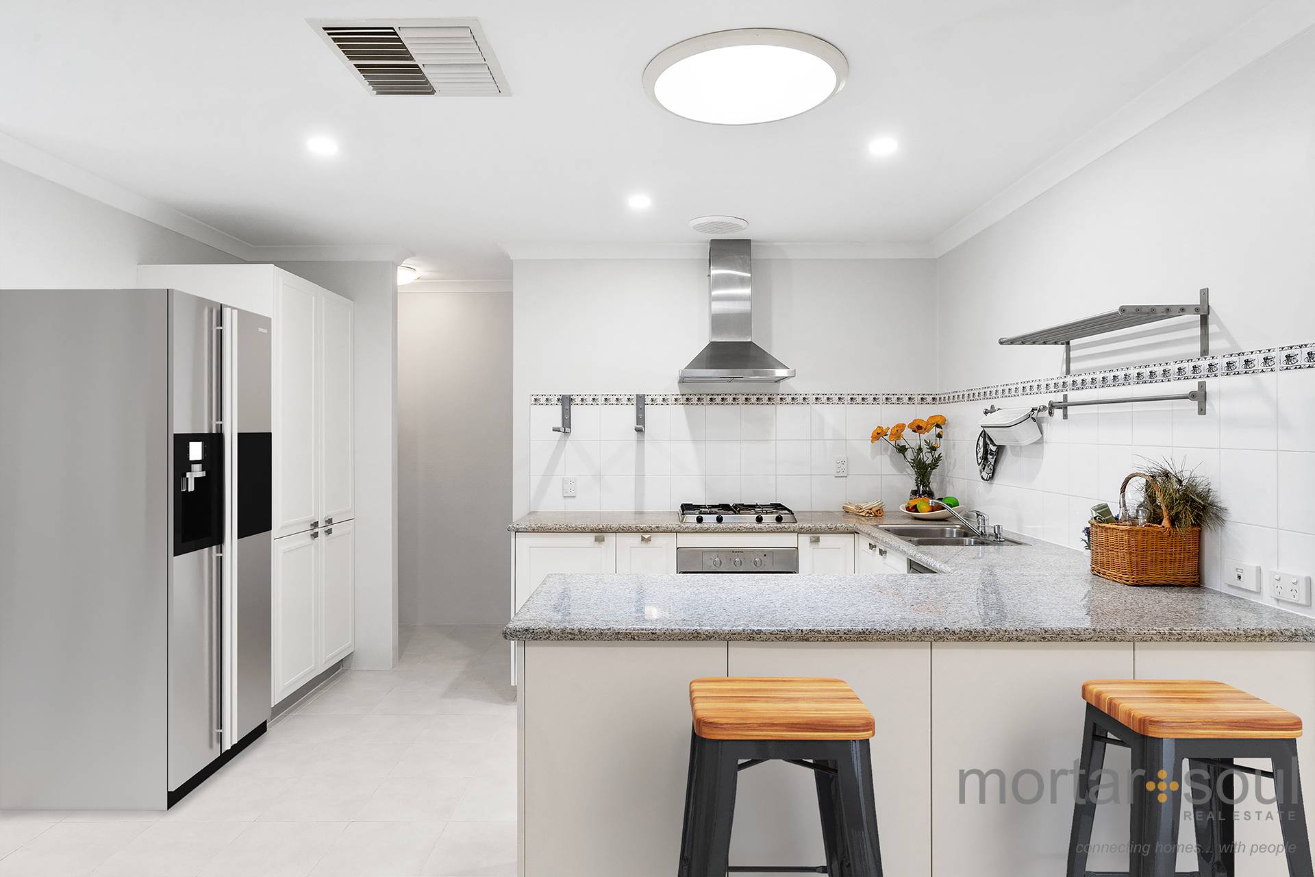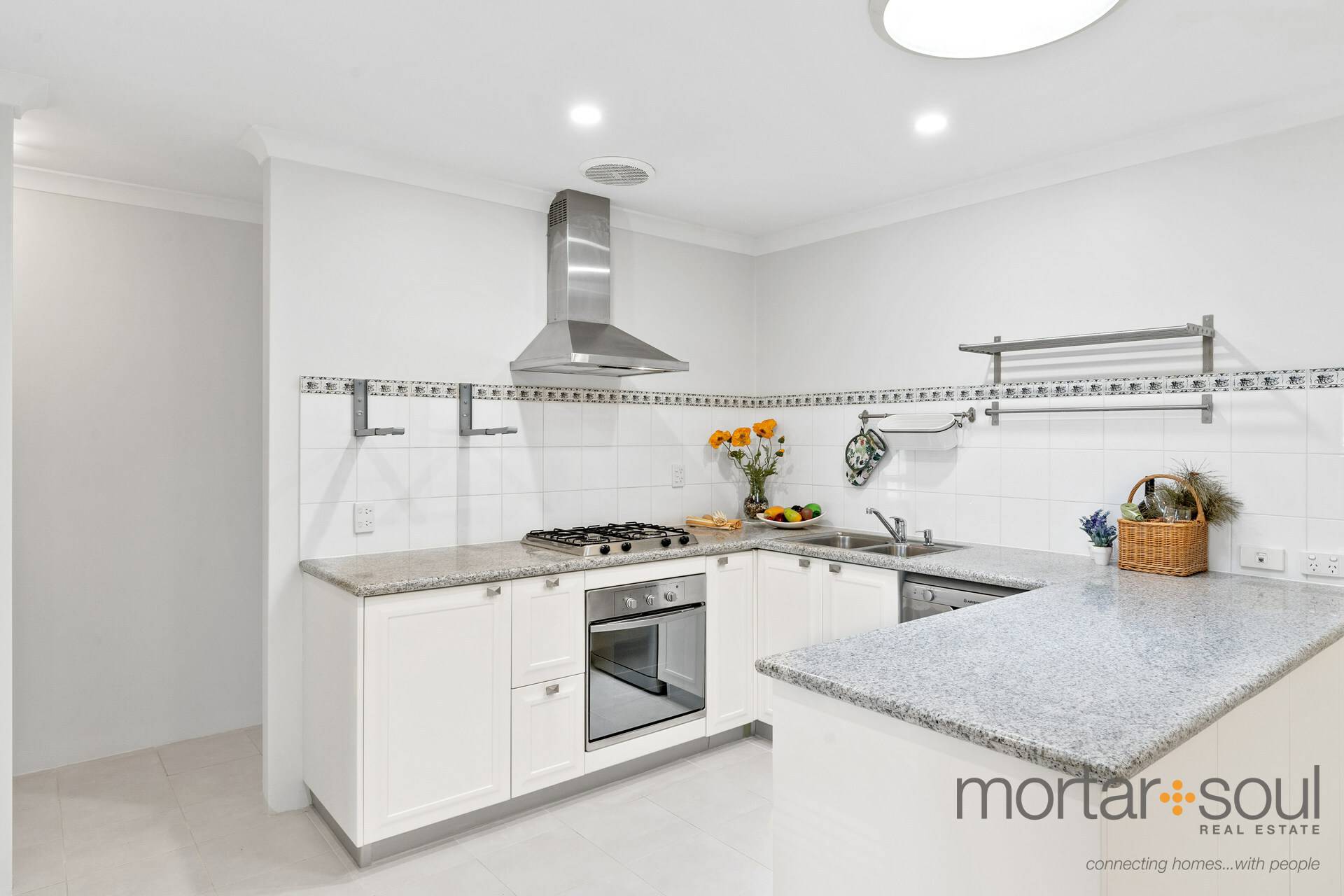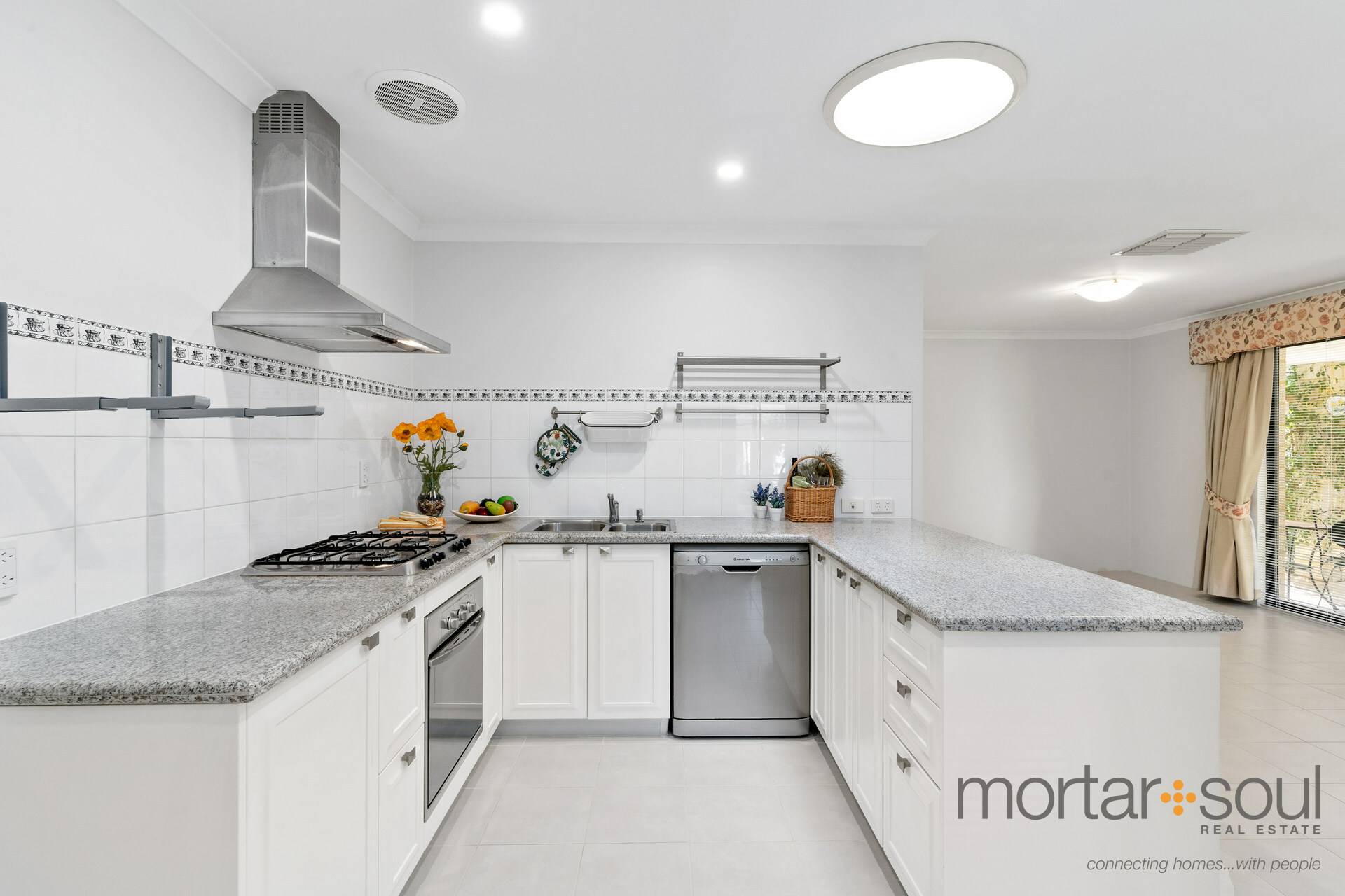 The tiled front lounge room warmly welcomes you inside and precedes a central kitchen, as well as a spacious open-plan living and dining area right next to it. The latter seamlessly extends outdoors to a huge covered alfresco space that encourages year-round entertaining. Back inside, the kitchen itself is stylish, has a feature skylight above it and plays host to sleek bench tops, double sinks and stainless-steel range-hood, gas-cooktop and oven appliances.