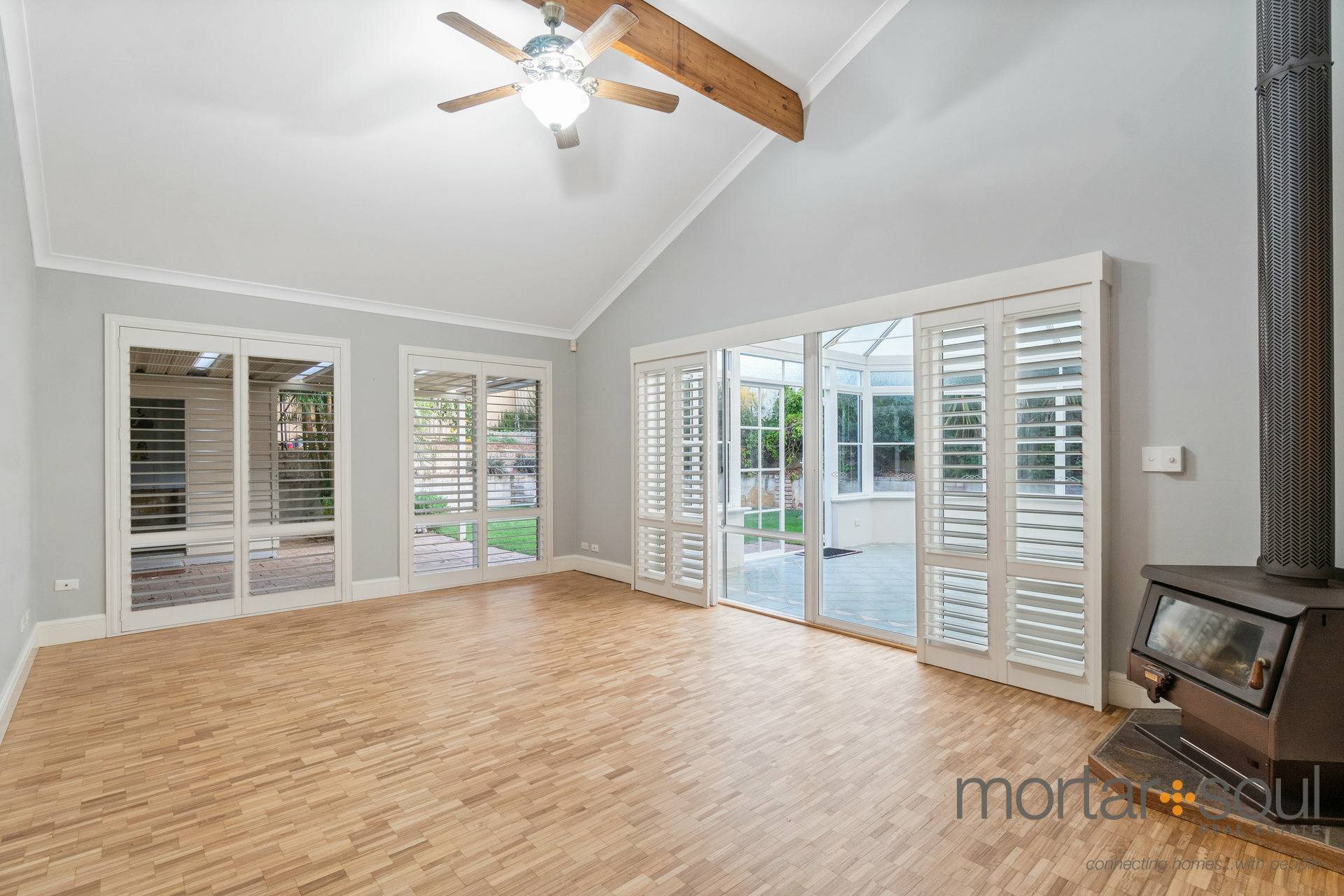 Striking character ceiling roses grace the carpeted front lounge and dining rooms – both of which are reserved for those formal occasions. Exceptional wooden parquetry flooring, a high angled ceiling, a fan and a corner wood-fire heater make up the large separate games room that has direct access to a traditional pitched English-style conservatory patio – fully enclosed for sitting and relaxing and playing host to an openable window to let the fresh air in. Double French doors off here reveal a spacious backyard-lawn area with established avocado, lime, lemon, orange, mandarin, mango fruit trees, a passionfruit vine, a small patio, a lean-to/storage area that works well as either a shed or cubby house for the kids and heaps of room for a future swimming pool, if you are that way inclined.