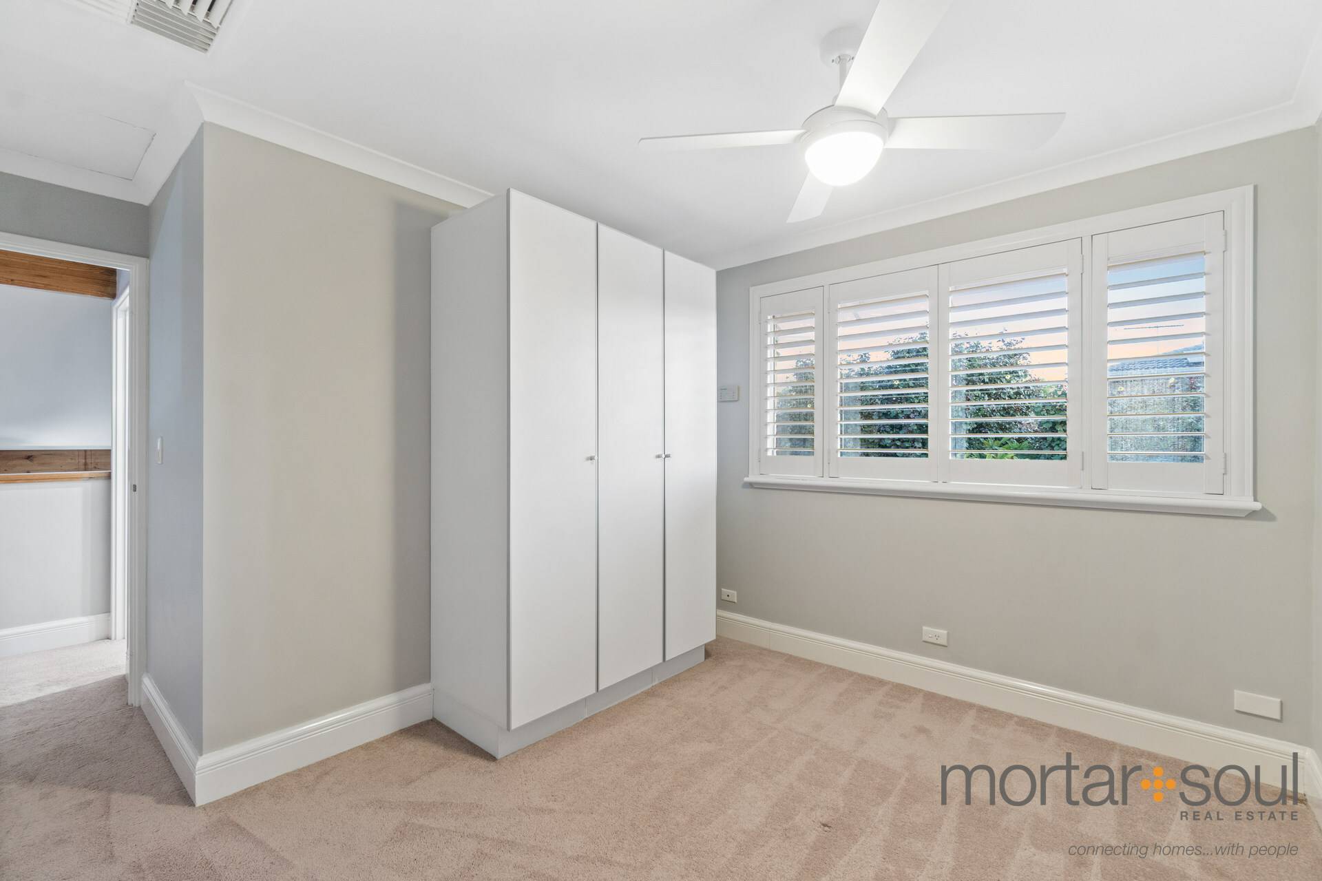 Beyond leafy front gardens and established lawns lies a carpeted front study inside – off the entry and neighbouring a welcoming master-bedroom suite with a ceiling fan, a fitted walk-in wardrobe, extra storage under the stairs, split-system air-conditioning, a splendid front-garden aspect to wake up to, access out to a private side patio/courtyard and a stunningly-renovated ensuite bathroom – quality timber-look floor tiles, walk-in rain/hose shower, free-standing bathtub, vanity, toilet, full-height double linen press and all.