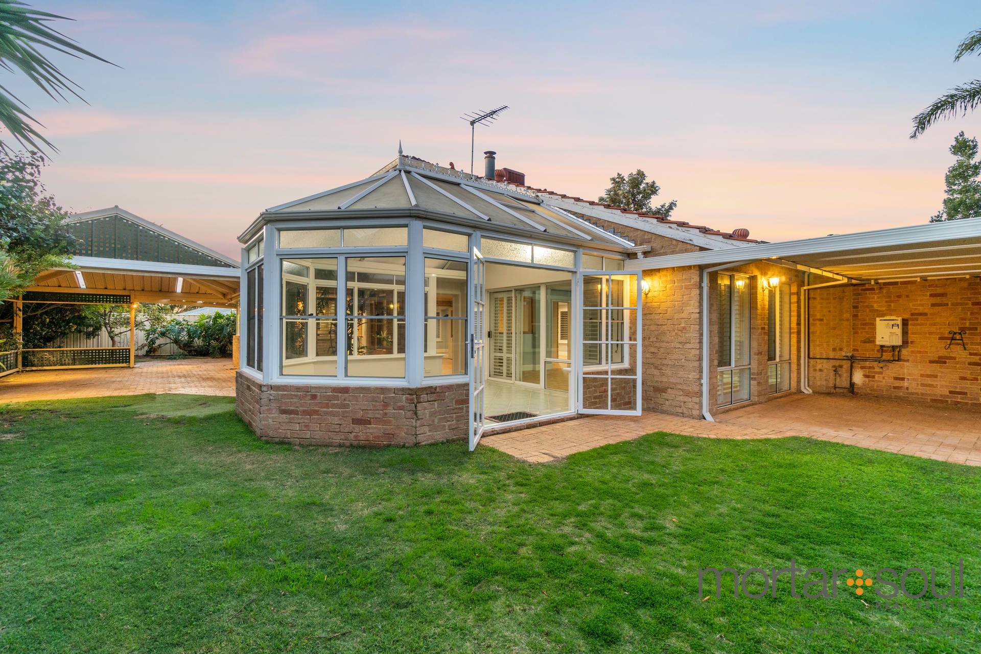 The main pitched alfresco-style patio-entertaining area can also be found at the rear, tranquilly wrapping around to another side patio with an under-cover garden shed and drive-through roller-door access from the double lock-up garage. The conservatory and alfresco spaces are also seamlessly accessible via a separate open-plan family, meals and kitchen area where more parquetry hardwood floors, a gas bayonet, timeless brickwork and delightful backyard views meet double sinks, a stainless-steel range hood, a five-burner Chef gas cooktop, a separate Westinghouse oven/grill, a stainless-steel Miele dishwasher and a walk-in pantry for good measure.