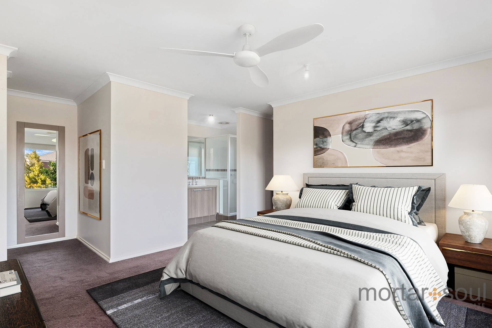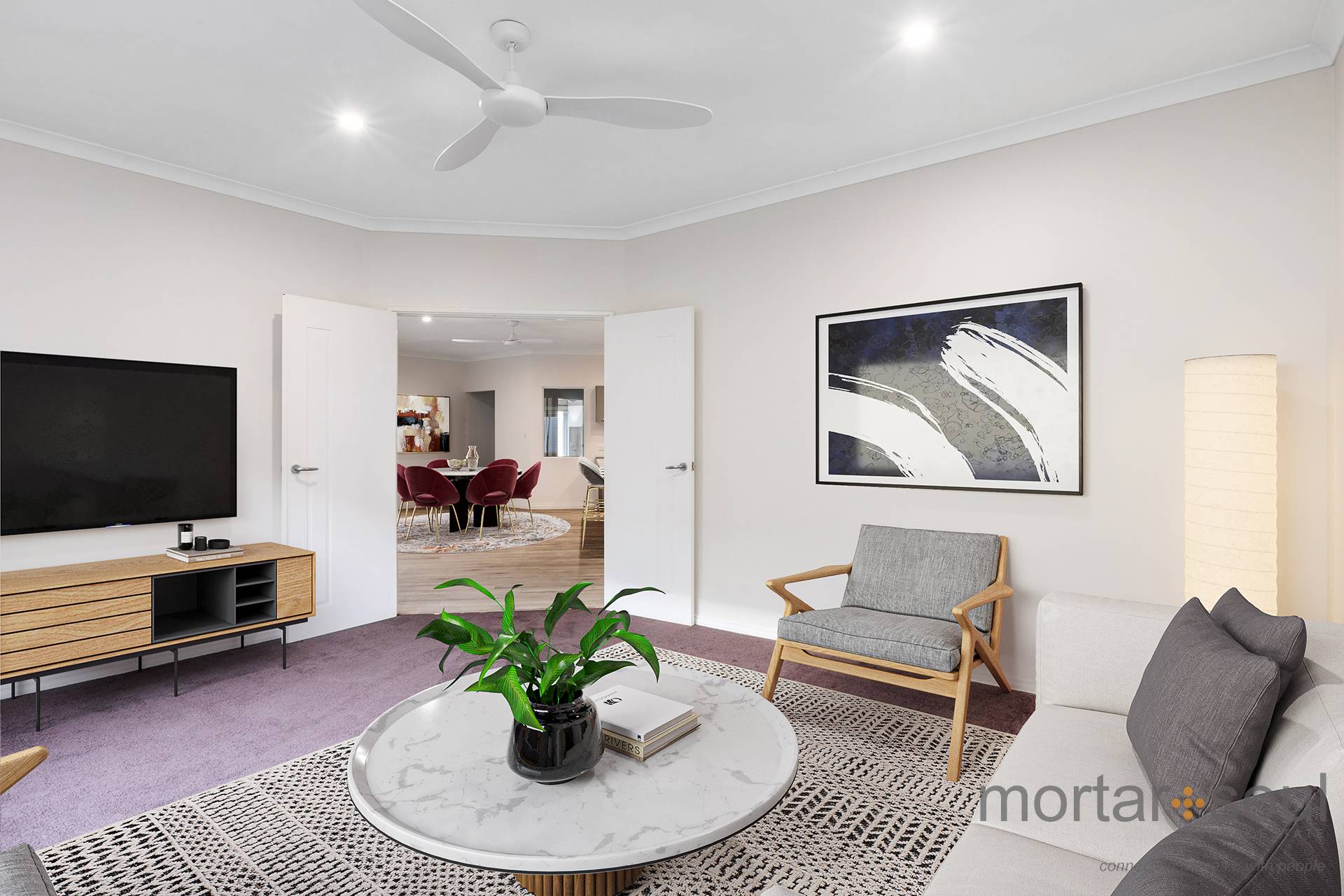 A huge carpeted master suite is the obvious pick of the bedrooms with its ceiling fan, fitted “his and hers” walk-in wardrobe and contemporary ensuite, comprising of a shower and twin “his and hers” vanities. Doubling your living options here is a massive carpeted theatre room behind the privacy of double doors – ceiling fan and all.