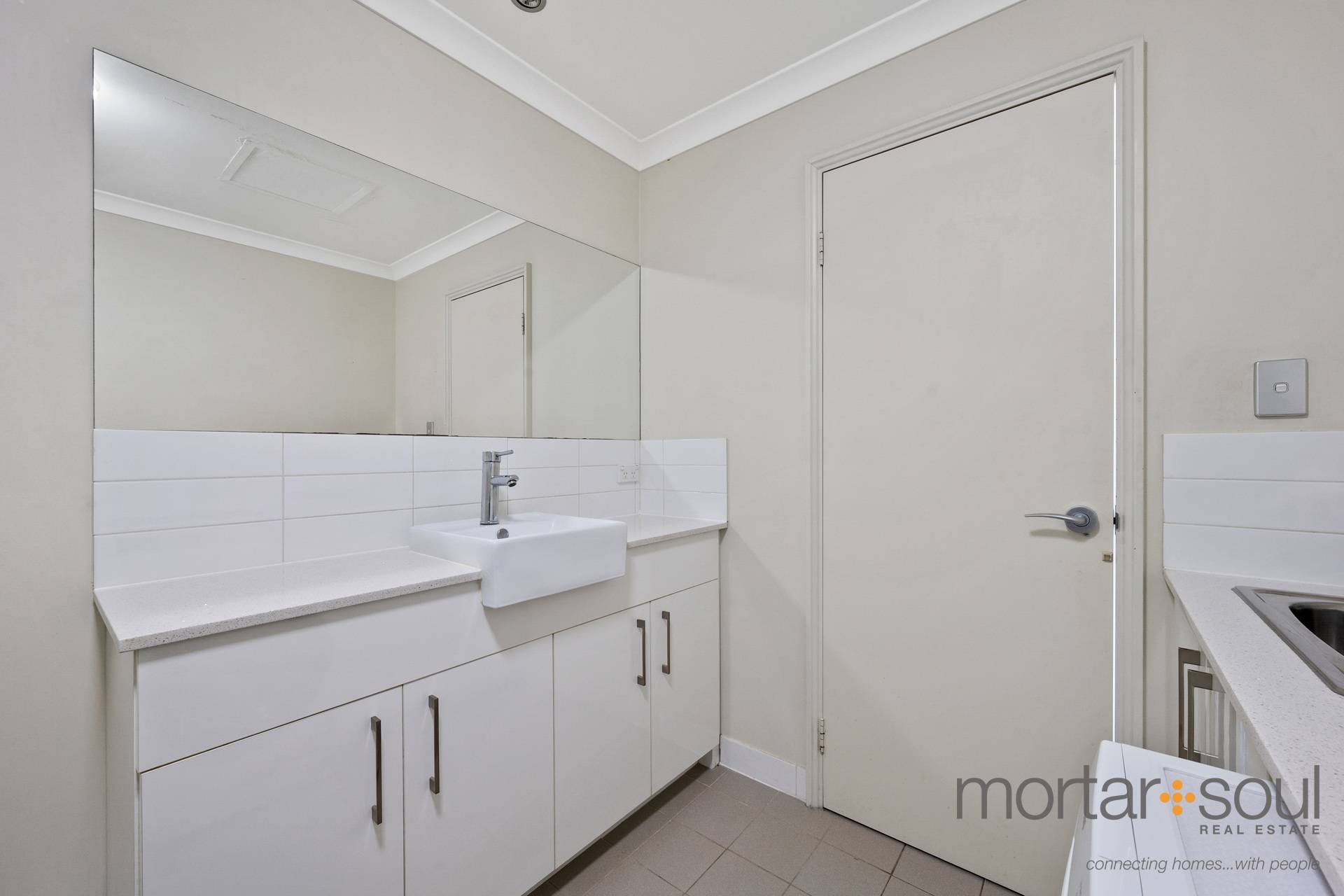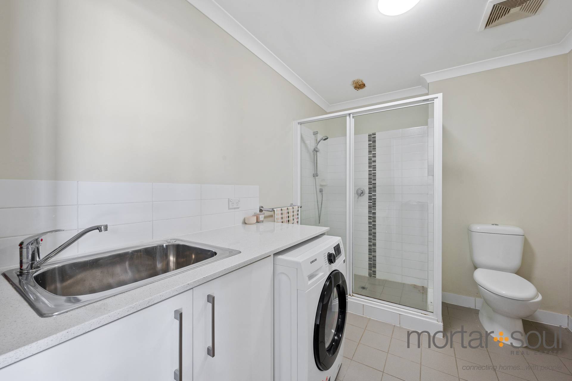 Welcoming you inside is an open-plan living, dining and kitchen area with a storage pantry, sleek white cabinetry, quality stone bench tops, microwave nook next to an under-bench oven, range hood, gas cooktop, double sinks with left hand drip tray over a the dishwasher, seamless outdoor access to a large 24m2 covered entertaining alfresco-style space, looking east off towards the picturesque Perth’s escarpment and rolling hills.