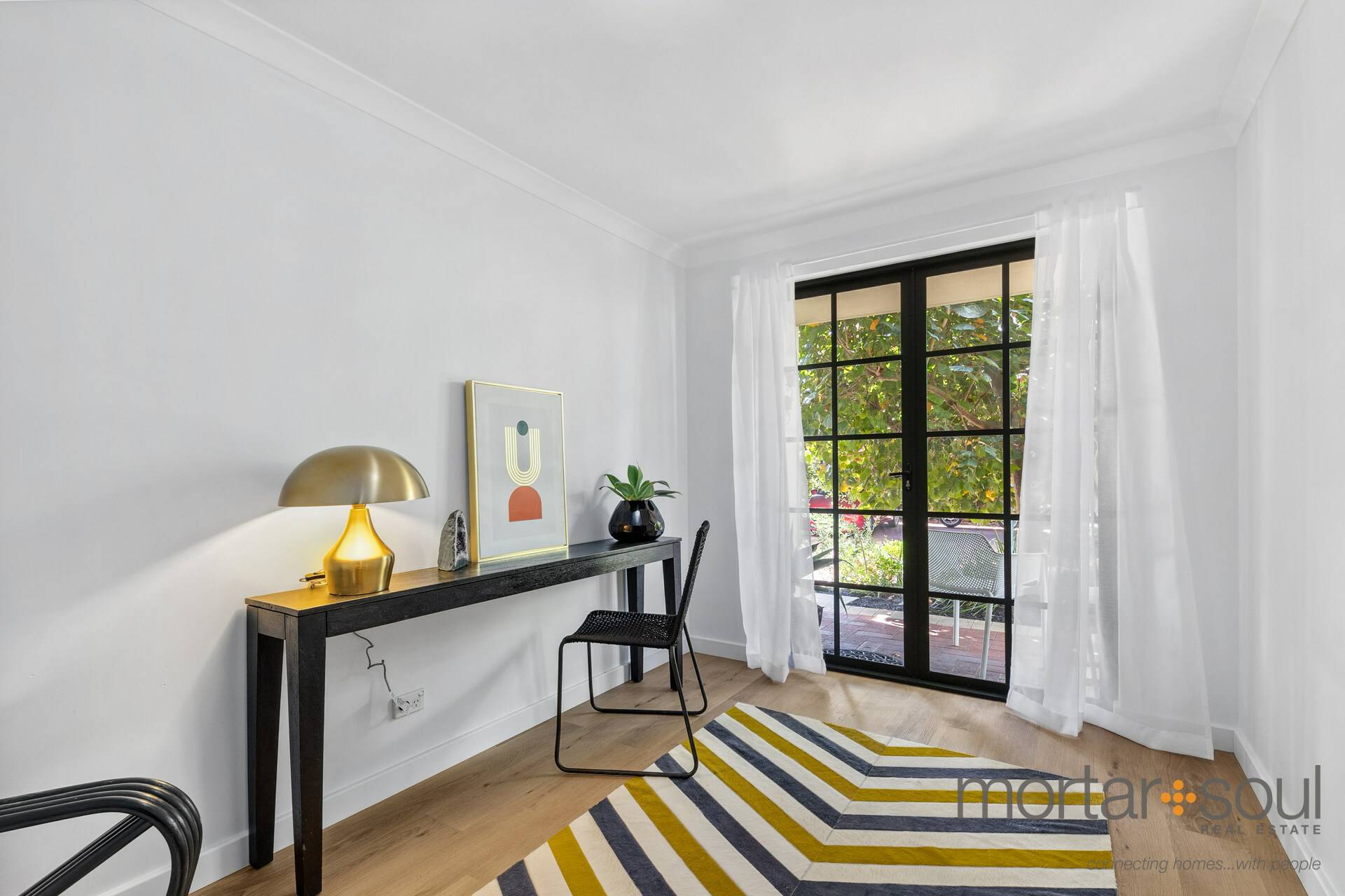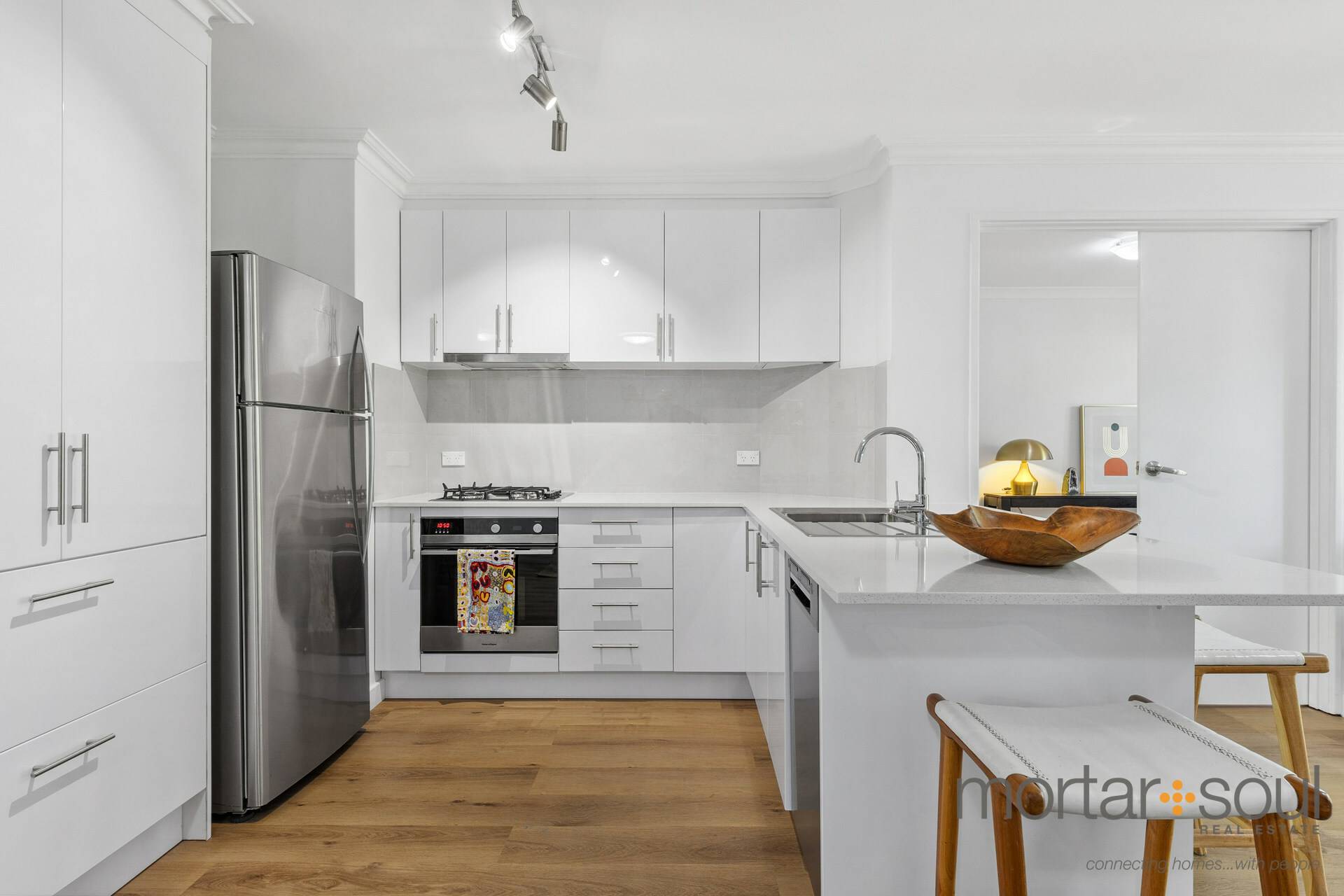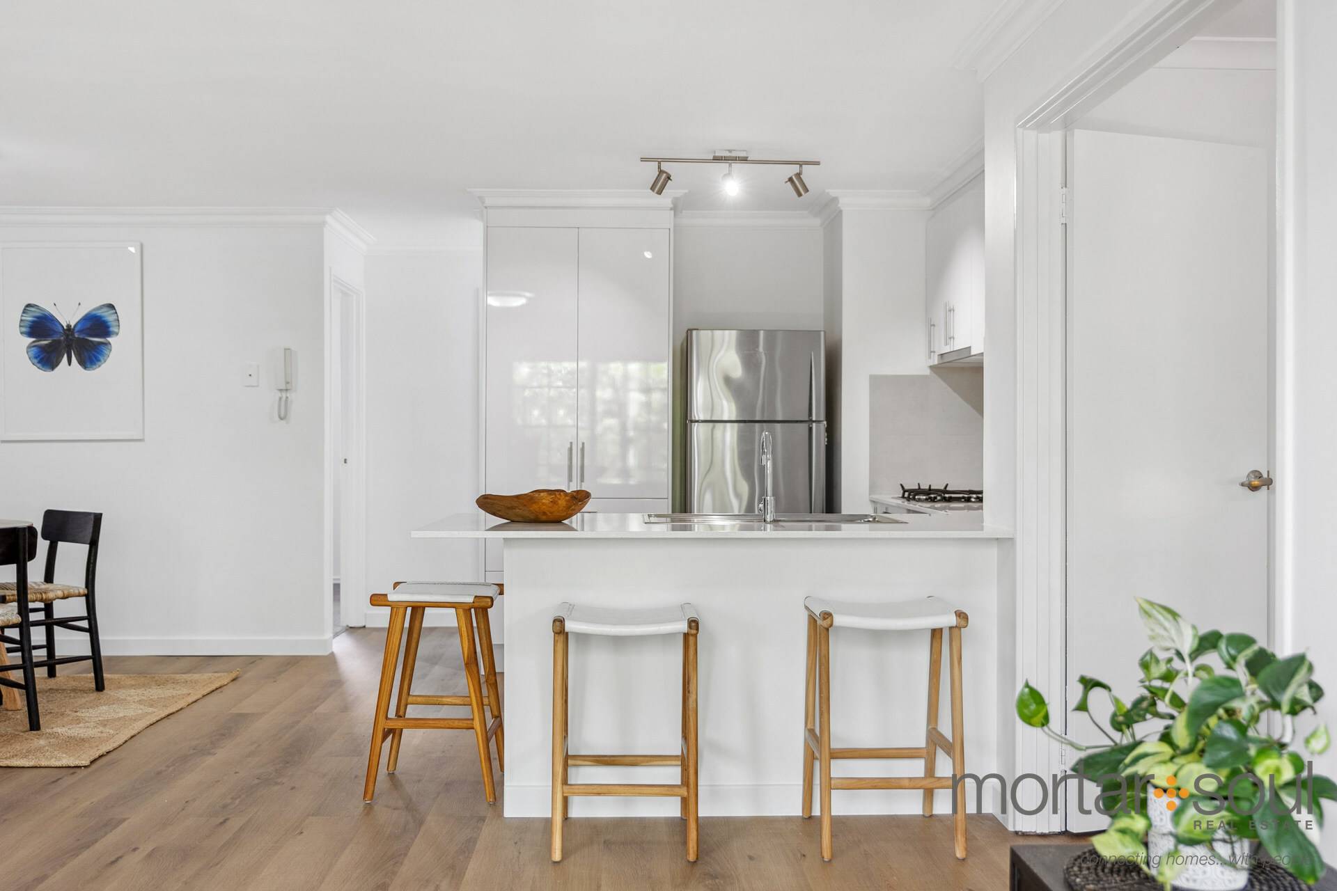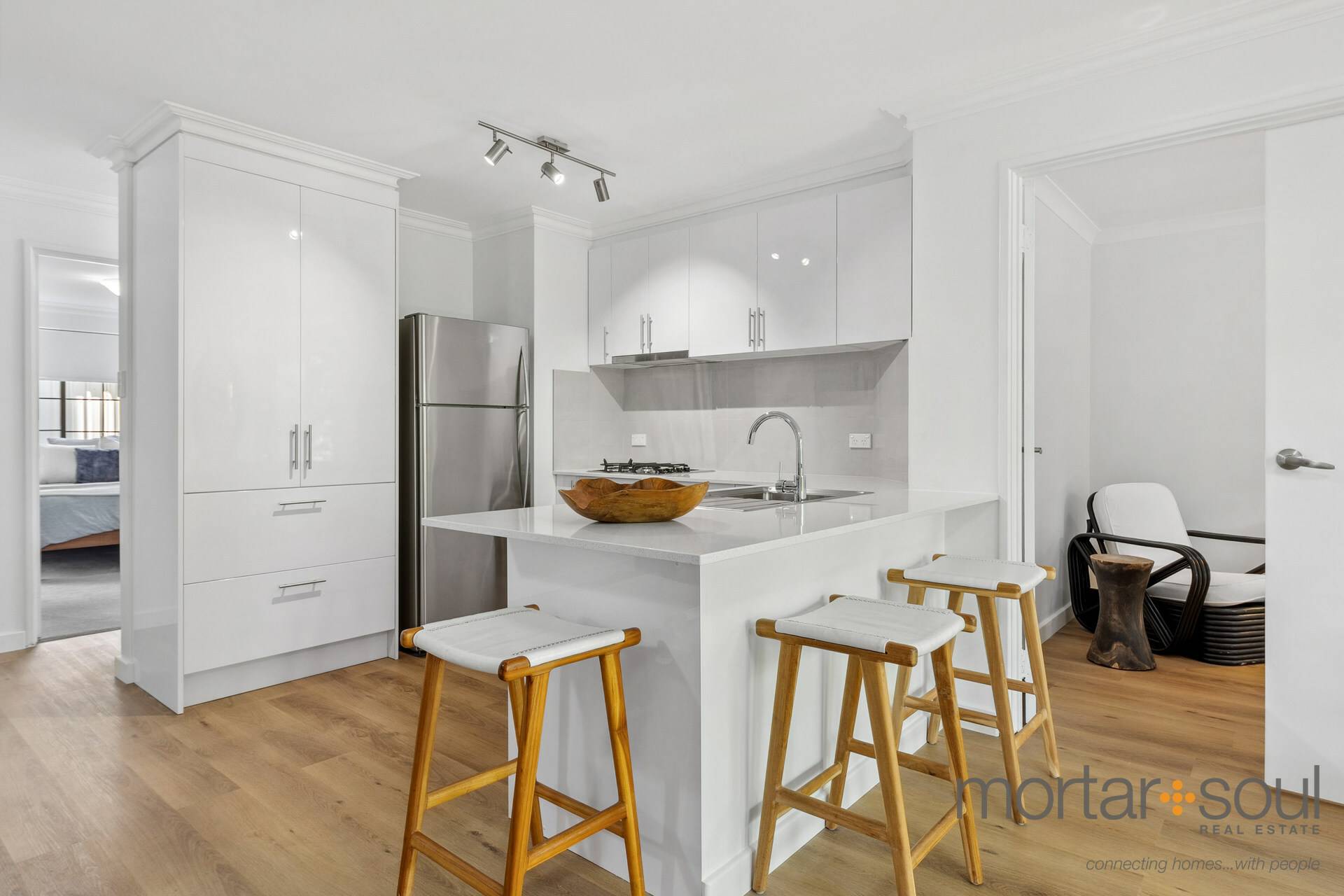 The apartment itself welcomes you inside via an open-plan living, dining and kitchen area that boasts split-system air-conditioning, stylish light fittings, sleek stone bench tops, a range hood, gas cooktop, under-bench oven, a stainless-steel dishwasher and enjoys double-door access out to a covered entertaining verandah. Double French doors off the garden-side verandah also link to a versatile third bedroom – or potential home office – that can be whatever you want it to be.