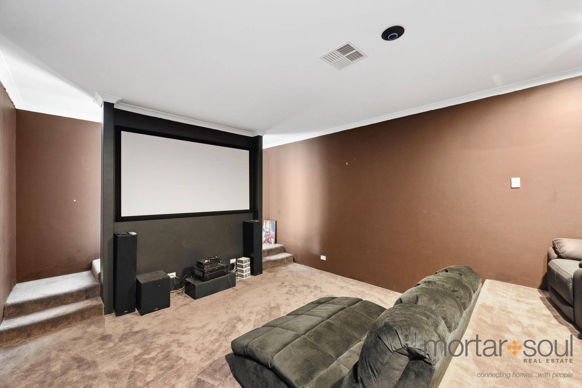 Beyond double entry doors lies a stunning central theatre room that is carpeted, tiered for the ultimate cinema-style experience and precedes a spacious open-plan living, dining and kitchen area – where most of your casual time will be spent. There, the stylish kitchen itself boasts a walk-in pantry, sparkling stone bench tops, a range hood, gas cooktop, an under-bench oven and double sinks for good measure.