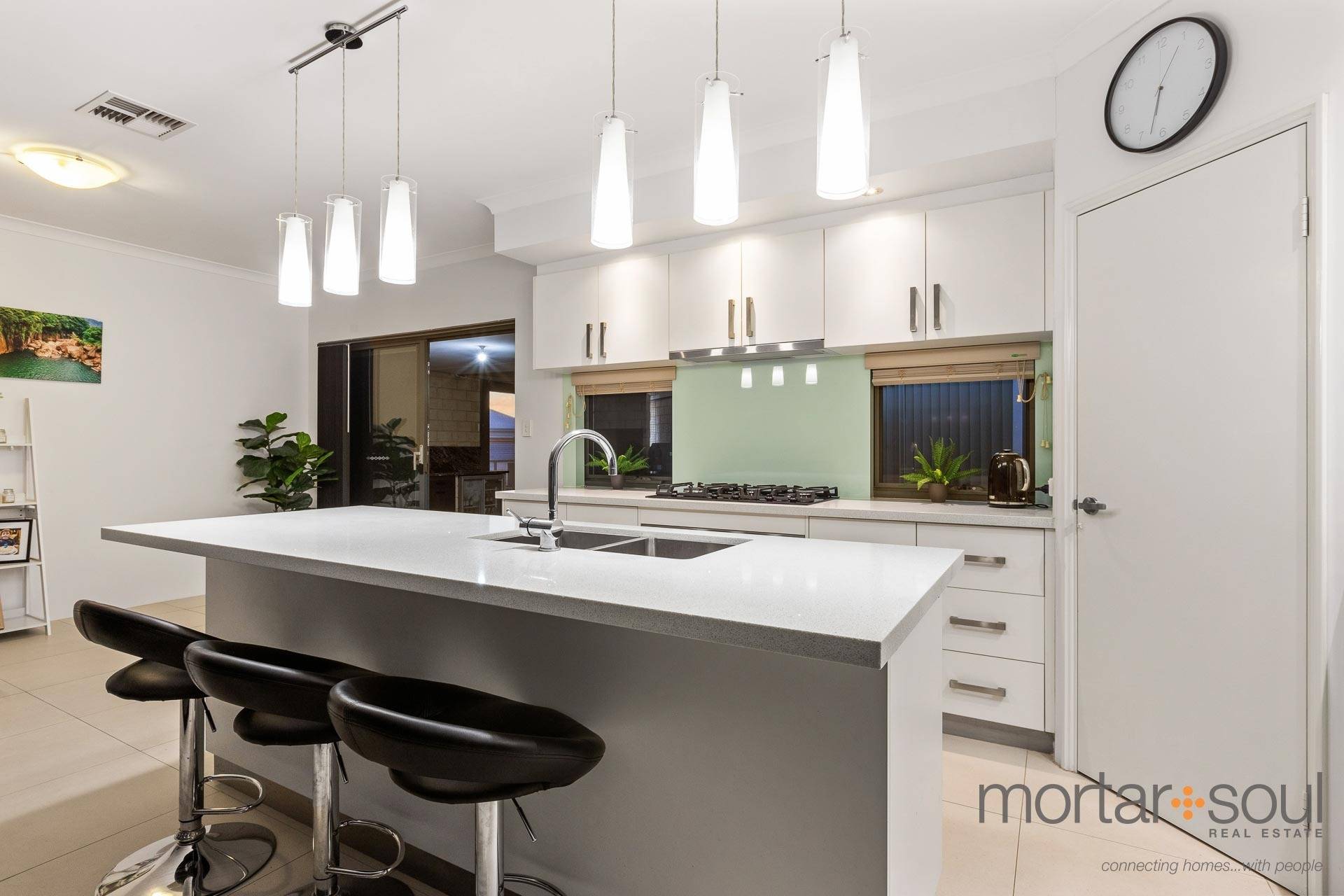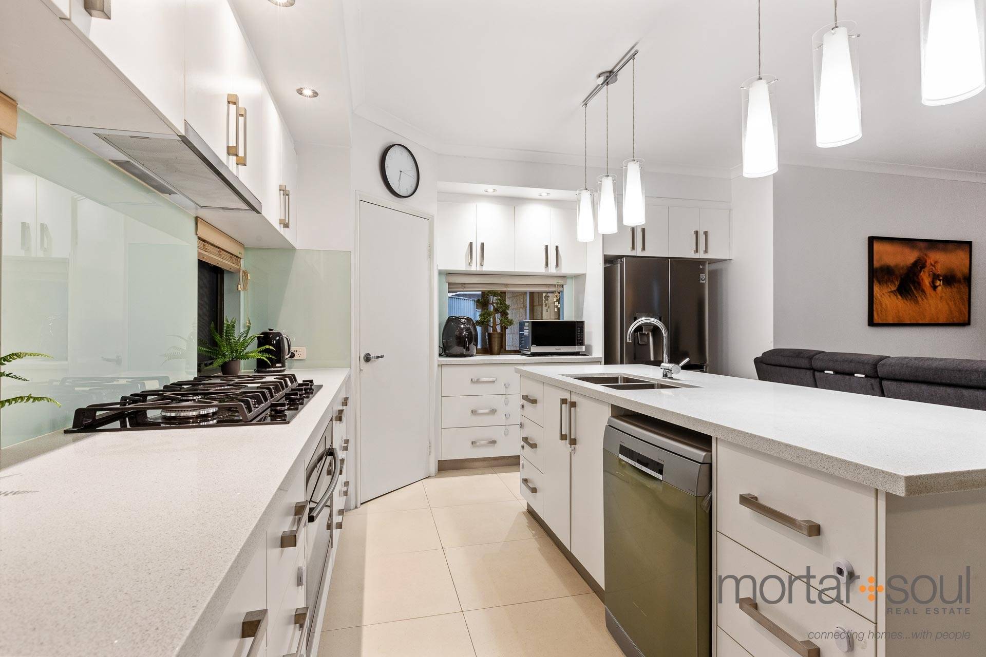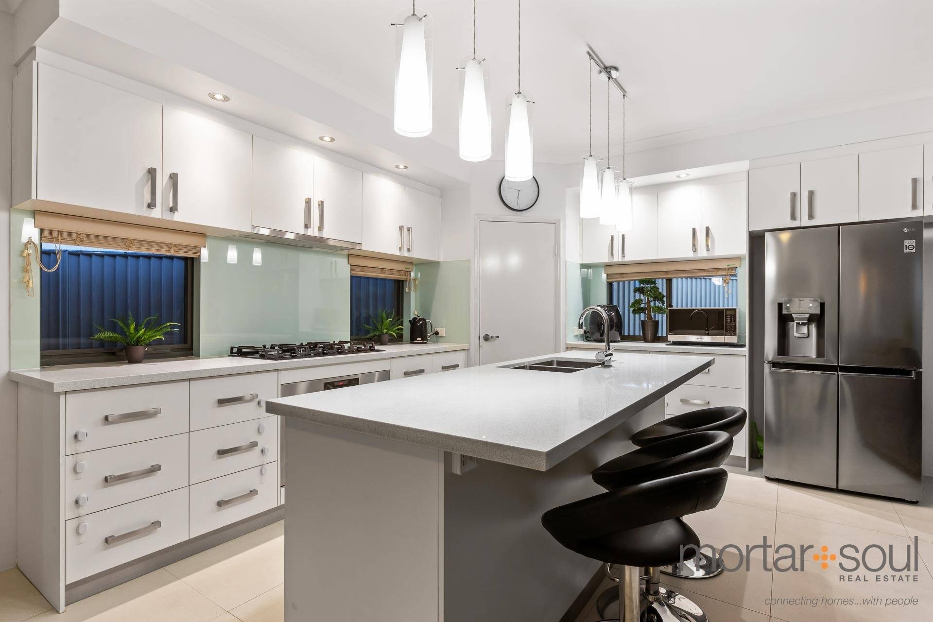 A spacious and tiled open-plan family, dining and kitchen area boasts a corner walk-in pantry, stylish pendant light fittings, a breakfast bar for quick bites and stainless-steel range-hood, gas-cooktop, oven and dishwasher appliances, as well as seamless access to a huge entertaining alfresco at the rear – complete with an outdoor-kitchen setup to impress your guests with.