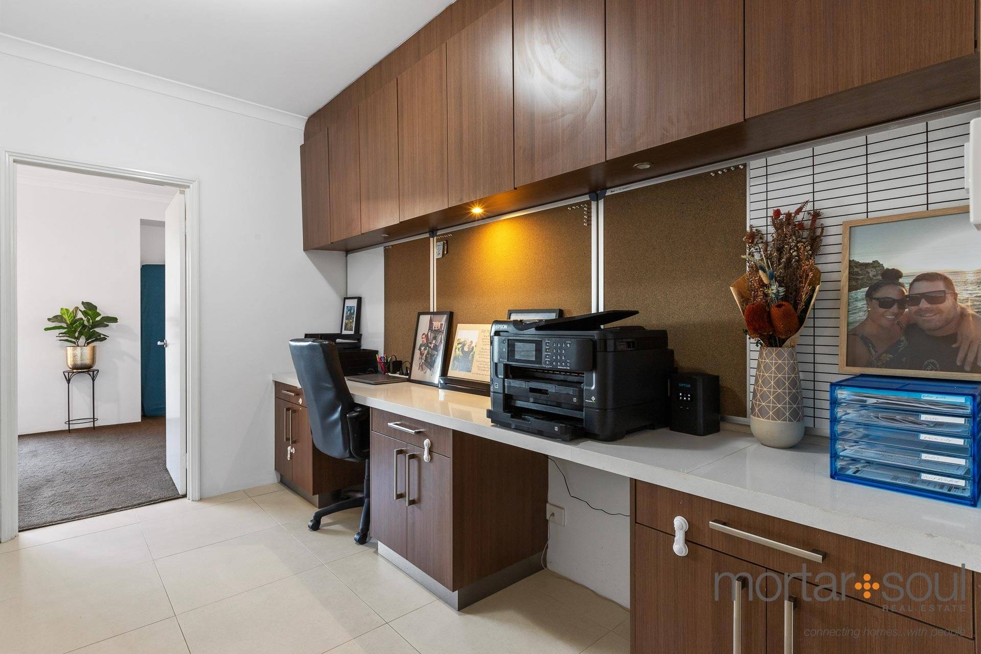 Back inside, all four bedrooms have built-in wardrobes – inclusive of a massive master suite that also comprises of a walk-in robe, as well as an open ensuite bathroom with a toilet and shower, either side of twin “his and hers” vanity basins. Servicing the minor sleeping quarters are a built-in hallway study desk (essentially a two-person workstation with heaps of built-in storage), a contemporary main family bathroom with a shower and separate bathtub, a separate toilet and a separate laundry with linen storage and external access for drying.