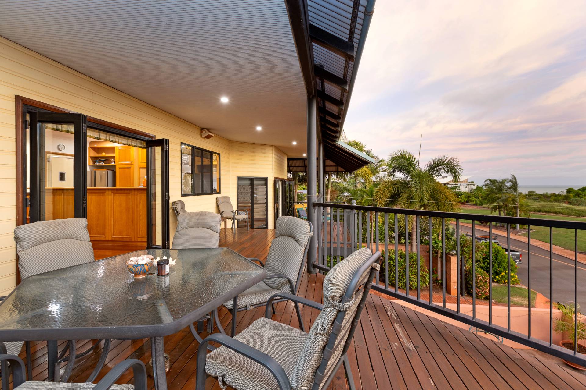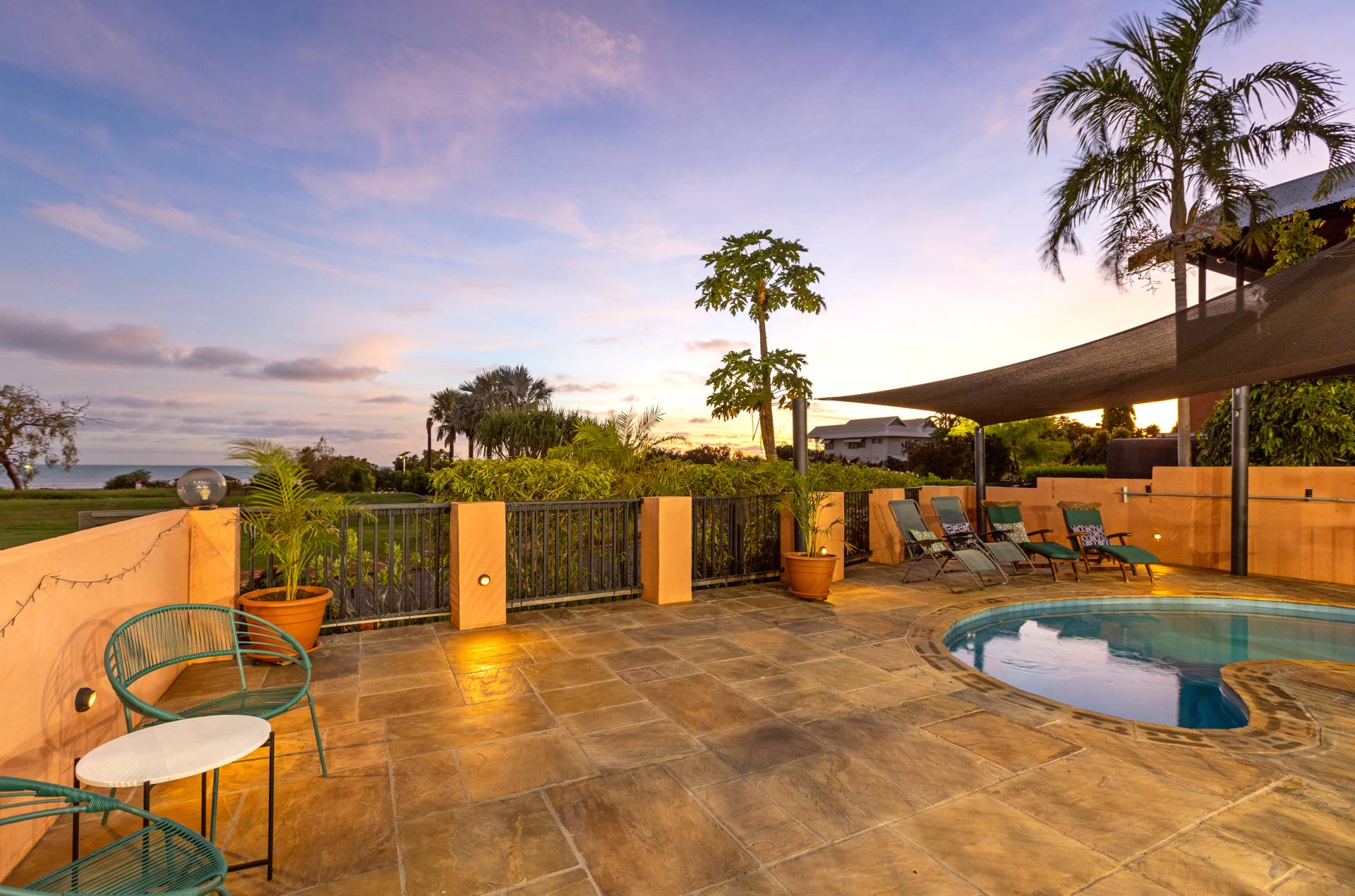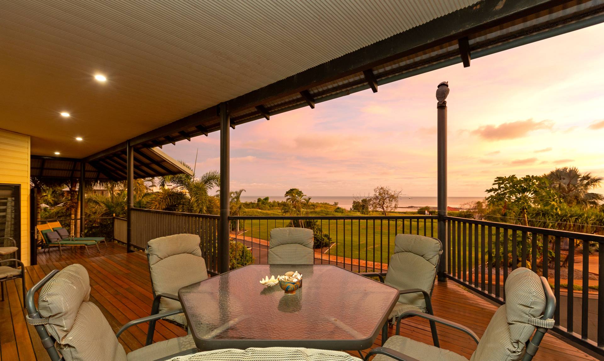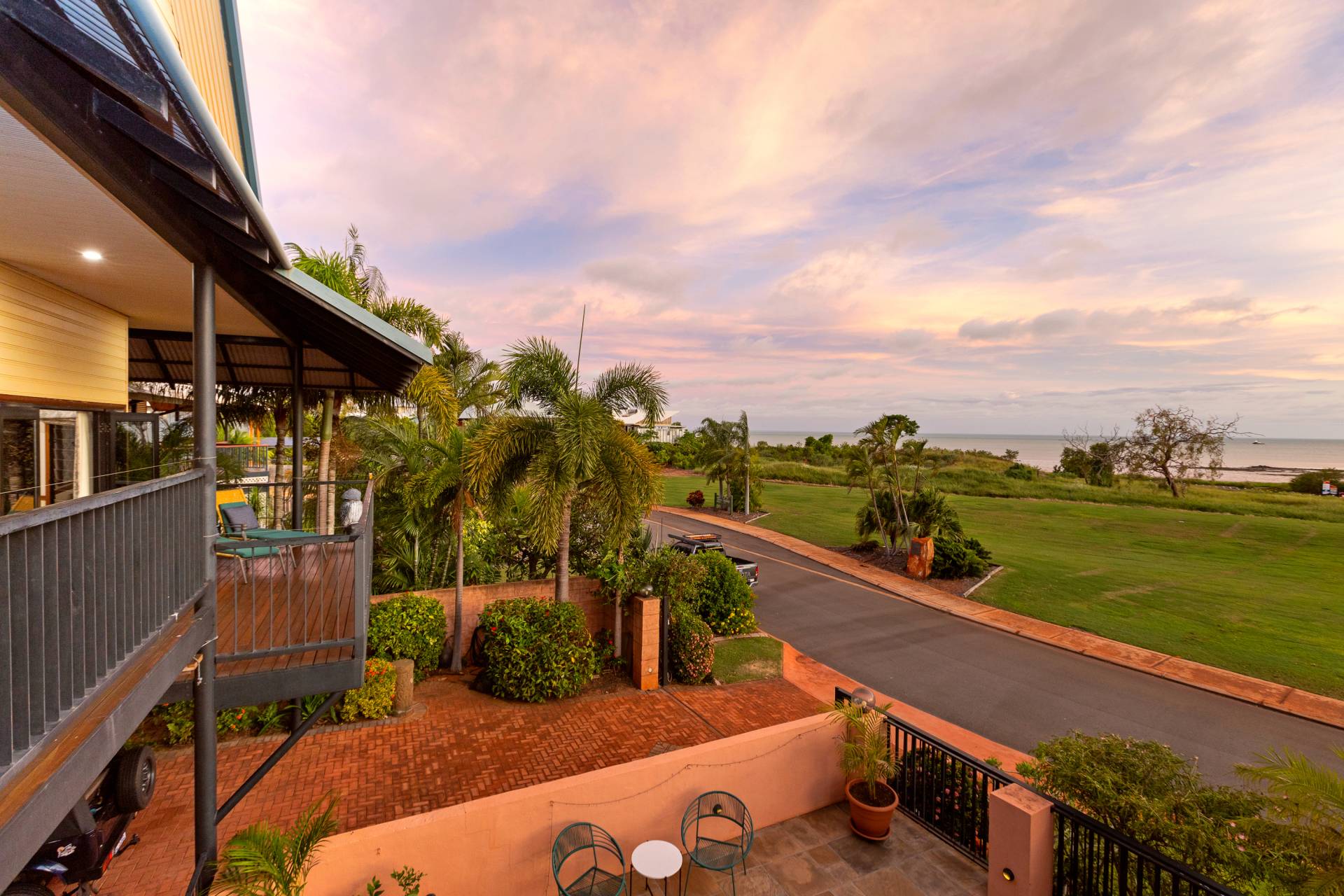Wake up to the glorious view of the azure waters of Roebuck Bay! Life doesn’t get much better with 20 Demco Drive, Broome. Walk across the road and you are on the beach for an early morning stroll or enjoy a sunset drink on your own balcony.                                            Flaunting sprawling balconies and a lush, established garden, 20 Demco boasts a perfect blend of picturesque outdoor living and seclusion from the bustling town of Broome.             Enforced with a brick exterior, this 5x4 with an office is ideal for large families or buyers searching for the right property for a bed-and-breakfast. Matched with a spacious storeroom and ample parking space, the property has two entrances, one on the right of the property, and one on the left, allowing complete separation of the first and second floors of the property if so desired.