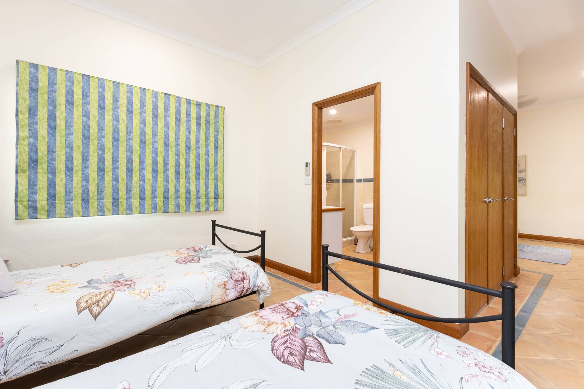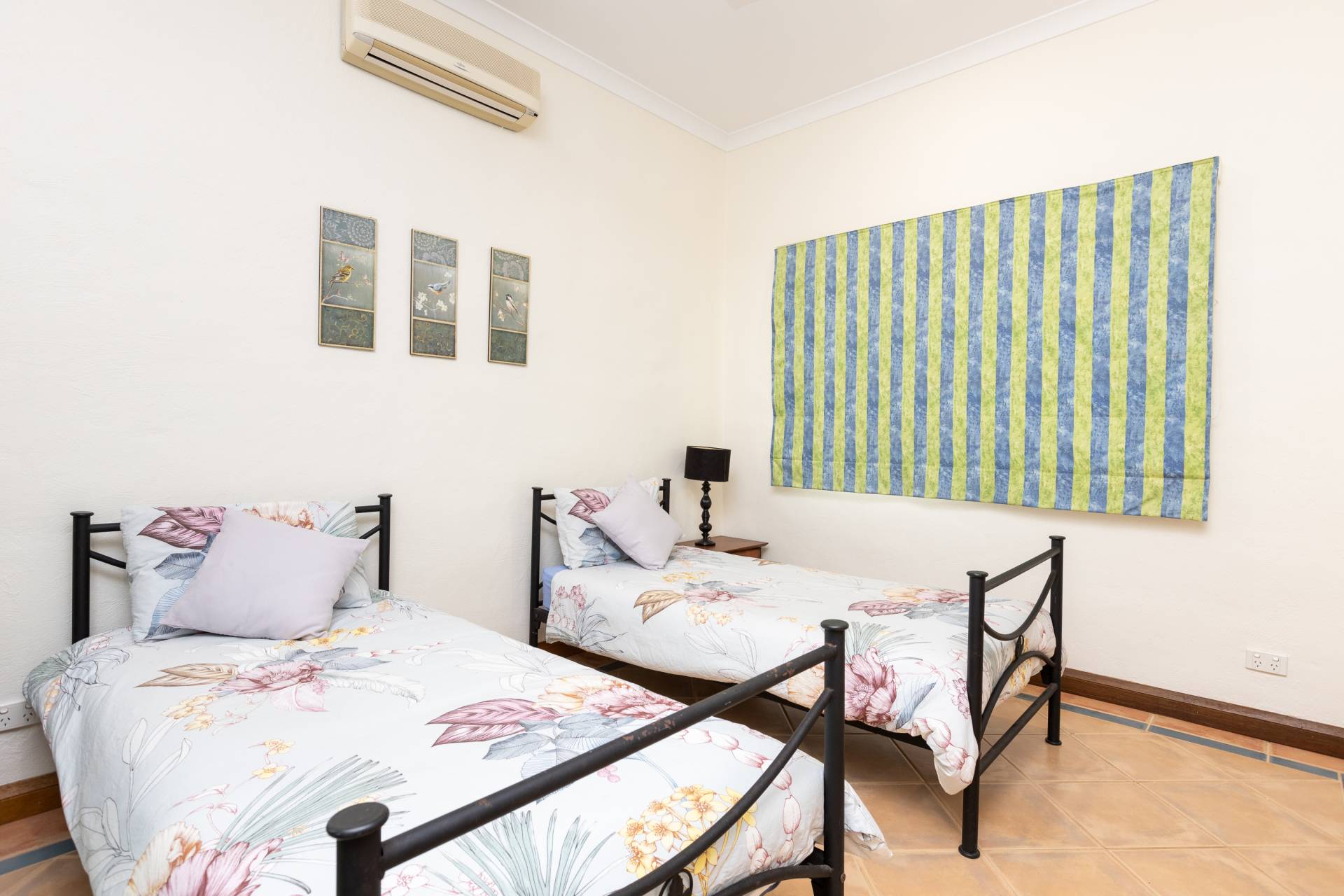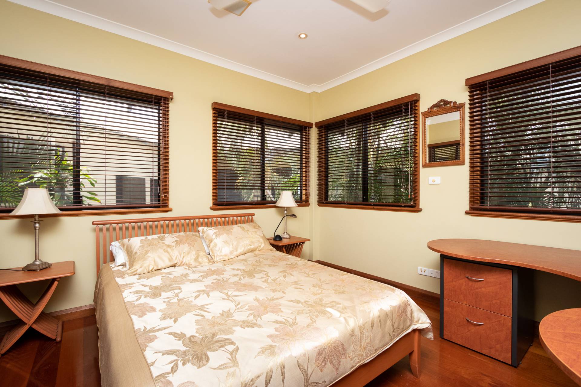 The home’s two downstairs bedrooms mirror those of the two upstairs bedrooms, both attaching to a semi ensuite; with the only dissimilarity being the miniature walk-in-wardrobes of the upstairs rooms. These rooms work to form a bedroom wing on the righthand side of the property. Window treatments in bedrooms (except main bedroom) have been upgraded to roman panel blinds. The master bedroom, fitted with a full ensuite, double sinks, and a walk-in wardrobe, is nestled privately away from the bedroom wing. The master is given full access to the balcony, which spans the front of the house and showcases pristine Roebuck Bay views. A guest washroom is located beside the second-floor landing for easy access and convenience.