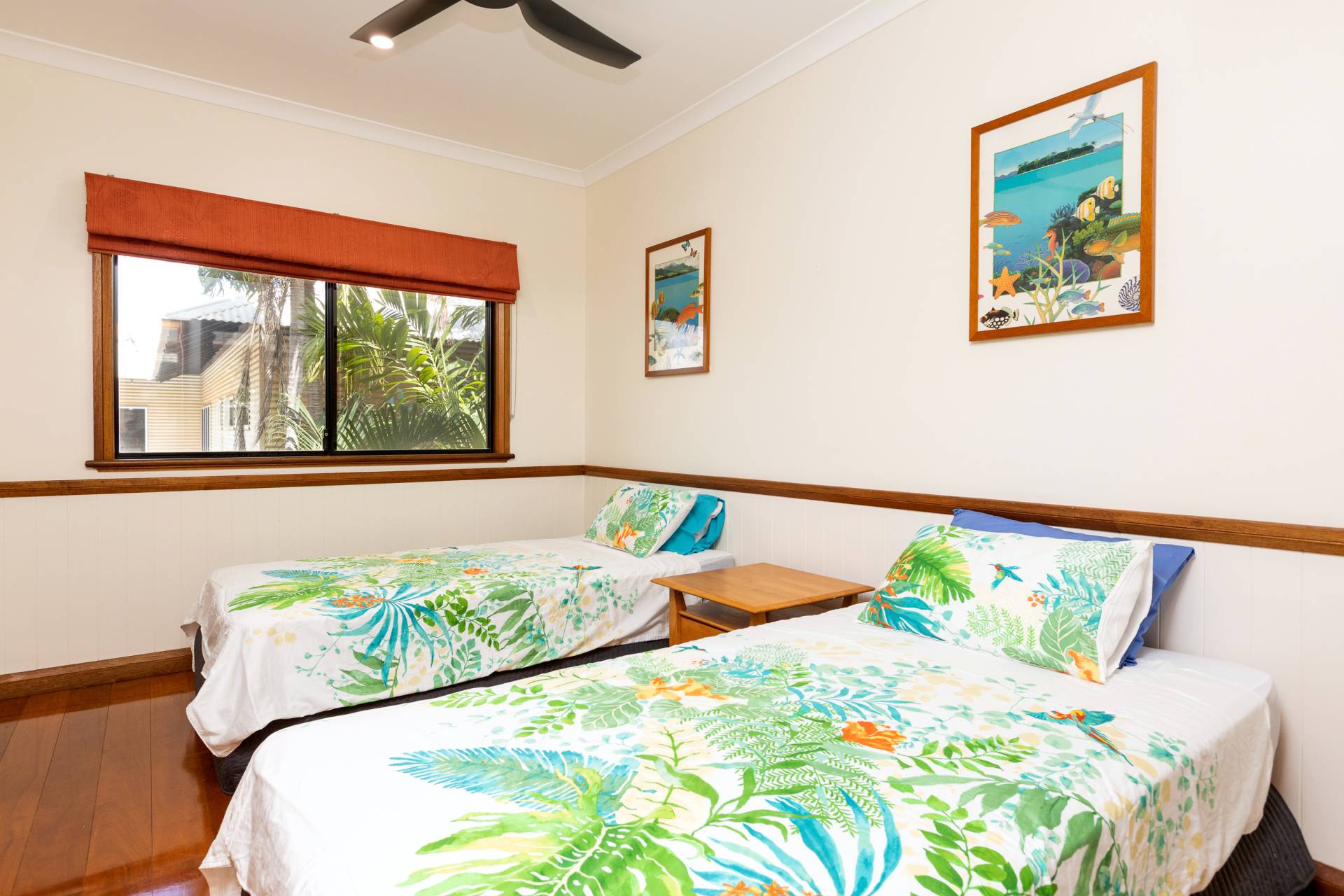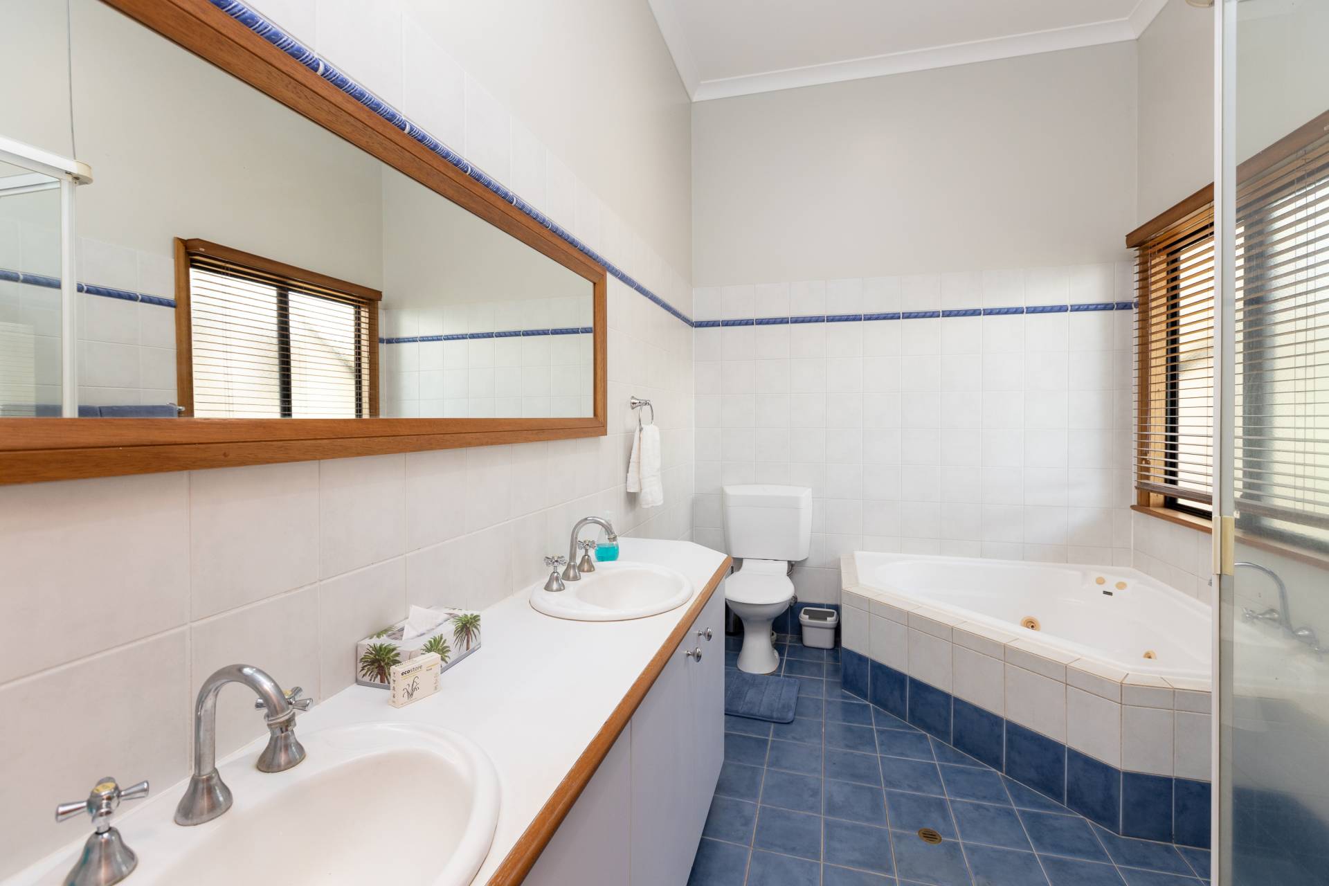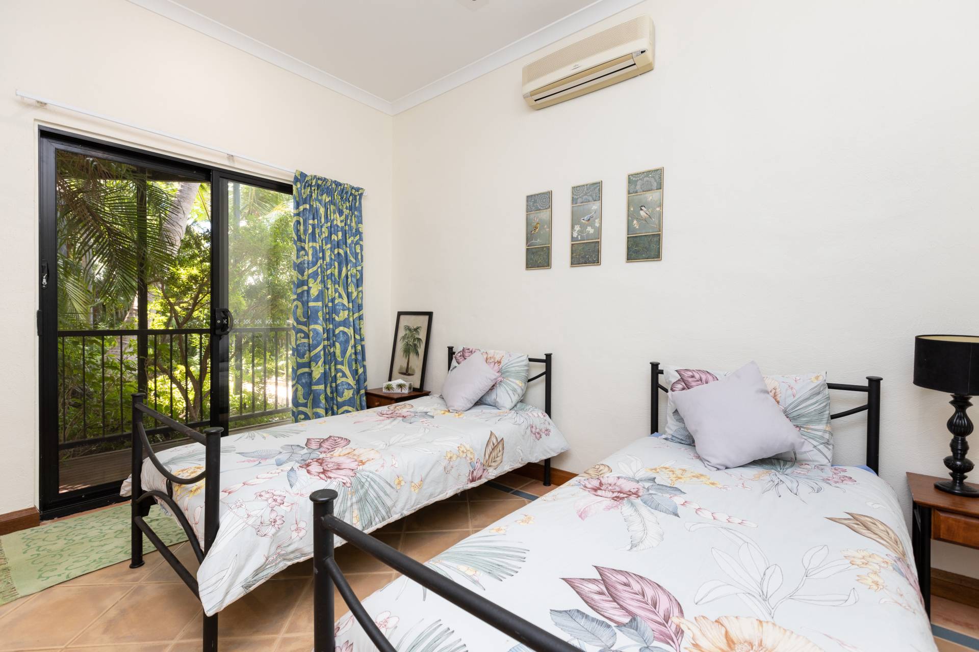 The home’s two downstairs bedrooms mirror those of the two upstairs bedrooms, both attaching to a semi ensuite; with the only dissimilarity being the miniature walk-in-wardrobes of the upstairs rooms. These rooms work to form a bedroom wing on the righthand side of the property. Window treatments in bedrooms (except main bedroom) have been upgraded to roman panel blinds. The master bedroom, fitted with a full ensuite, double sinks, and a walk-in wardrobe, is nestled privately away from the bedroom wing. The master is given full access to the balcony, which spans the front of the house and showcases pristine Roebuck Bay views. A guest washroom is located beside the second-floor landing for easy access and convenience.