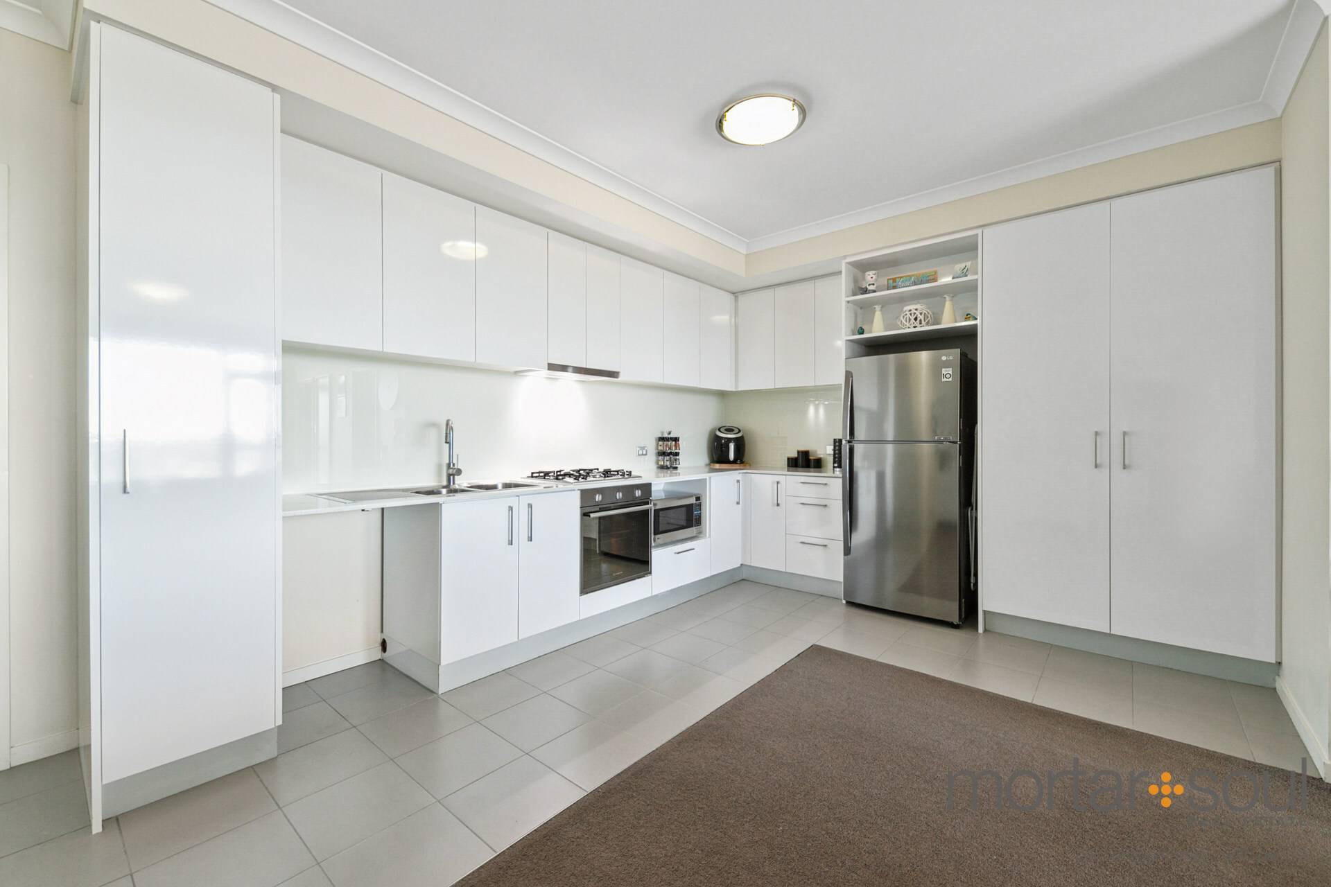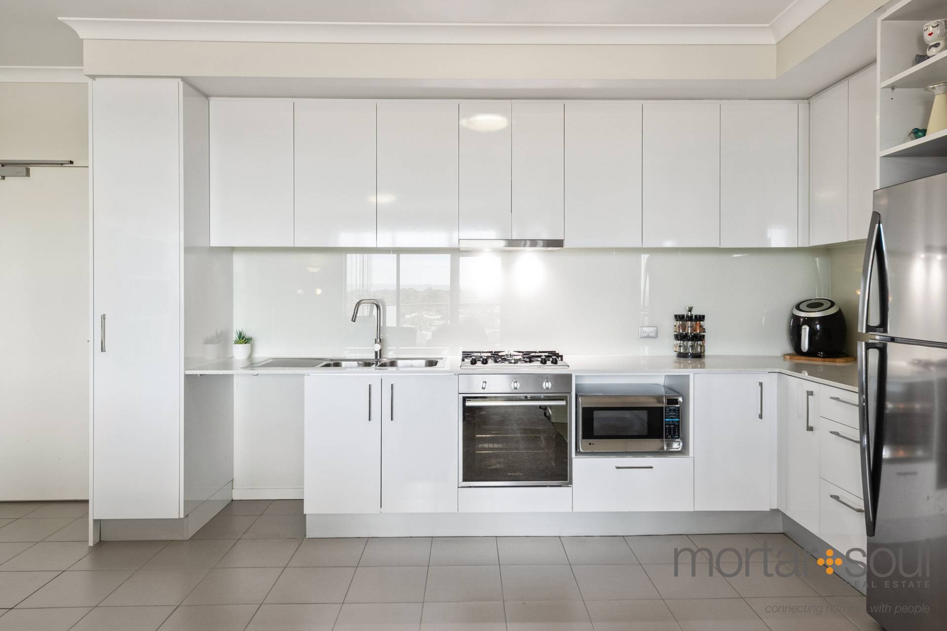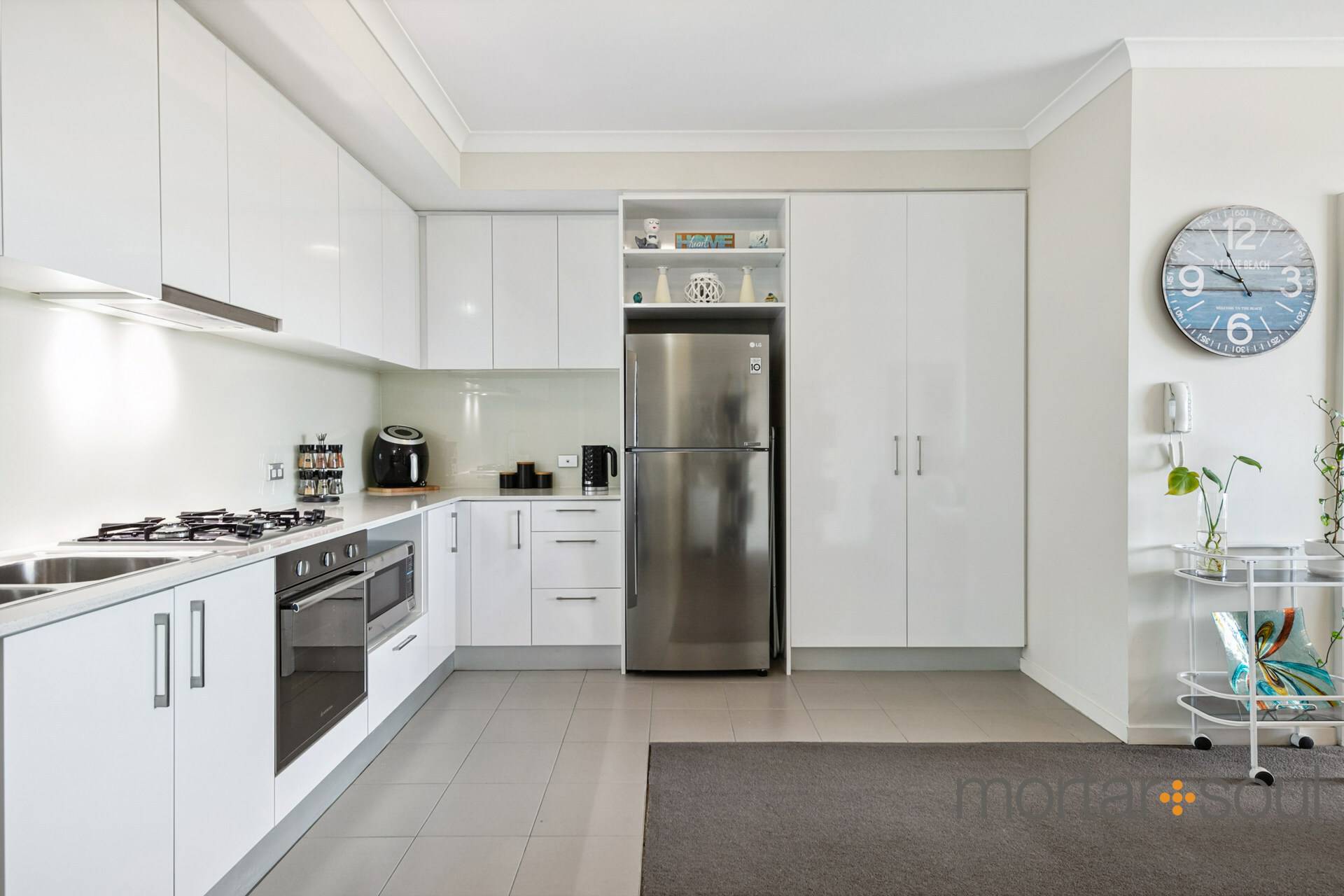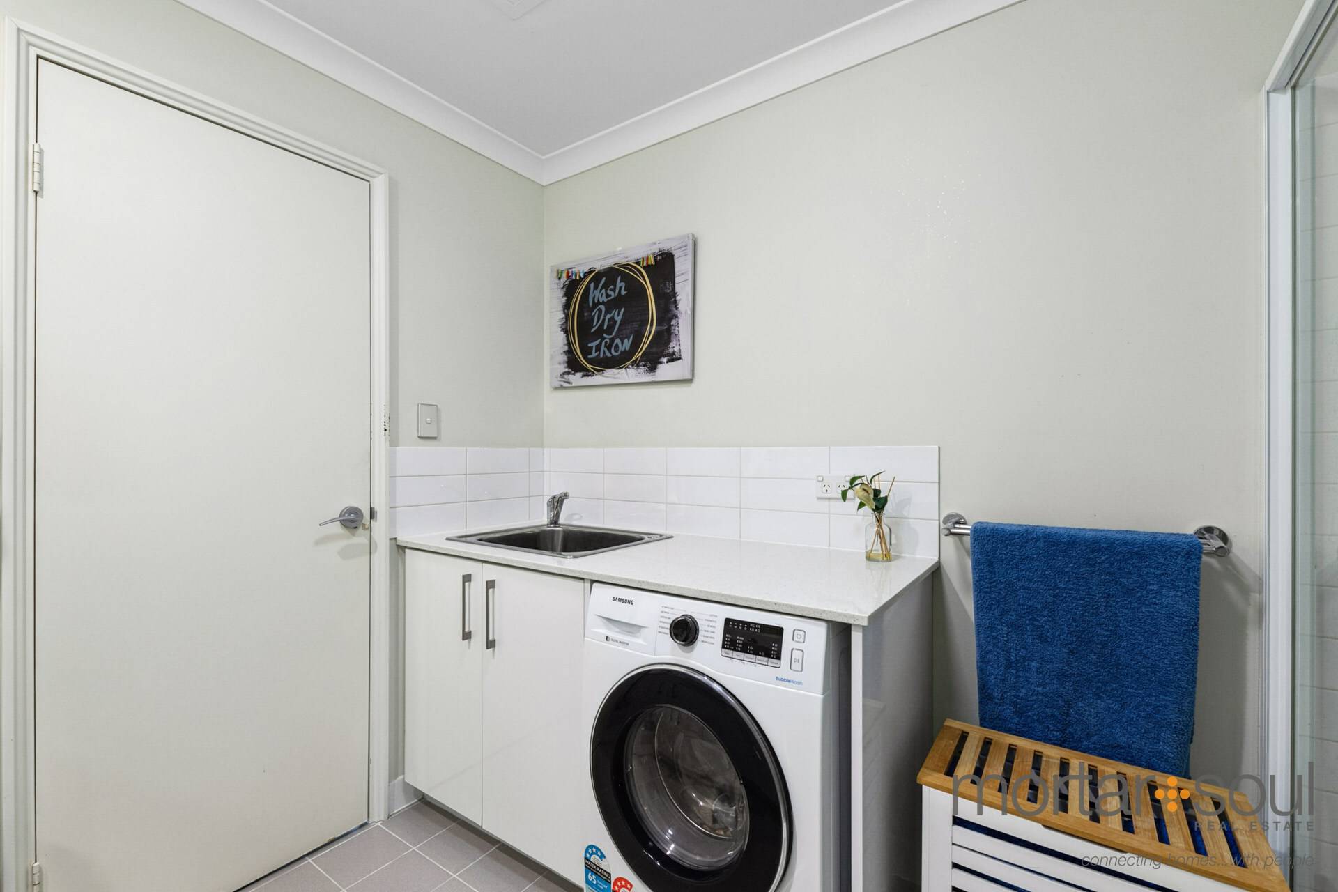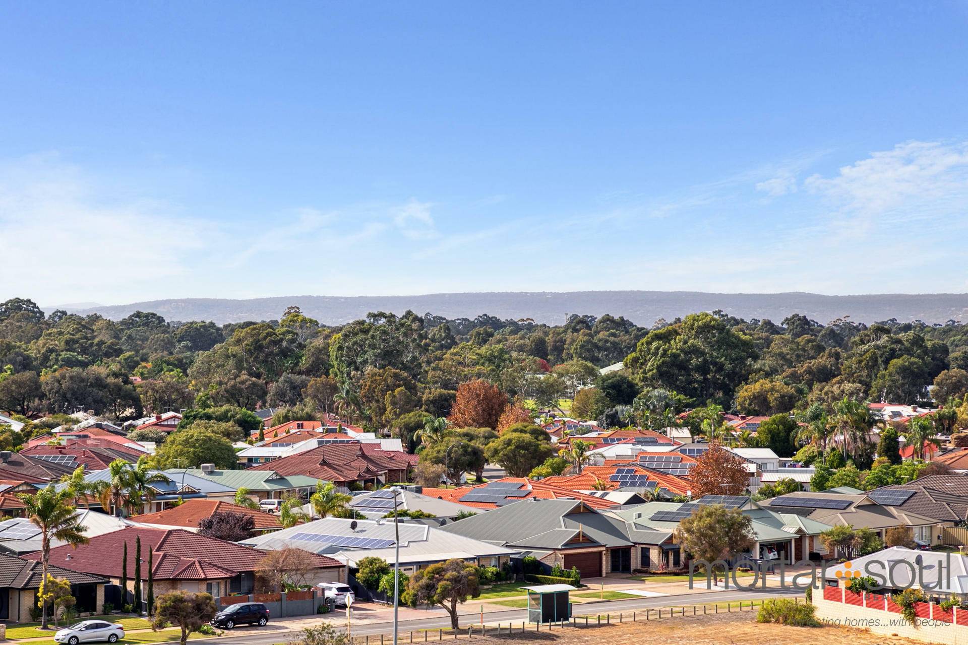 Welcoming you inside is an open-plan living, dining and kitchen area with a storage pantry, sleek white cabinetry, quality stone bench tops, microwave nook next to an under-bench oven, range hood, gas cooktop, double sinks with left hand drip tray over a the dishwasher, seamless outdoor access to a large 24m2 covered entertaining alfresco-style space, looking over the Kwinana Freeway off towards the picturesque Perth’s escarpment and rolling hills.