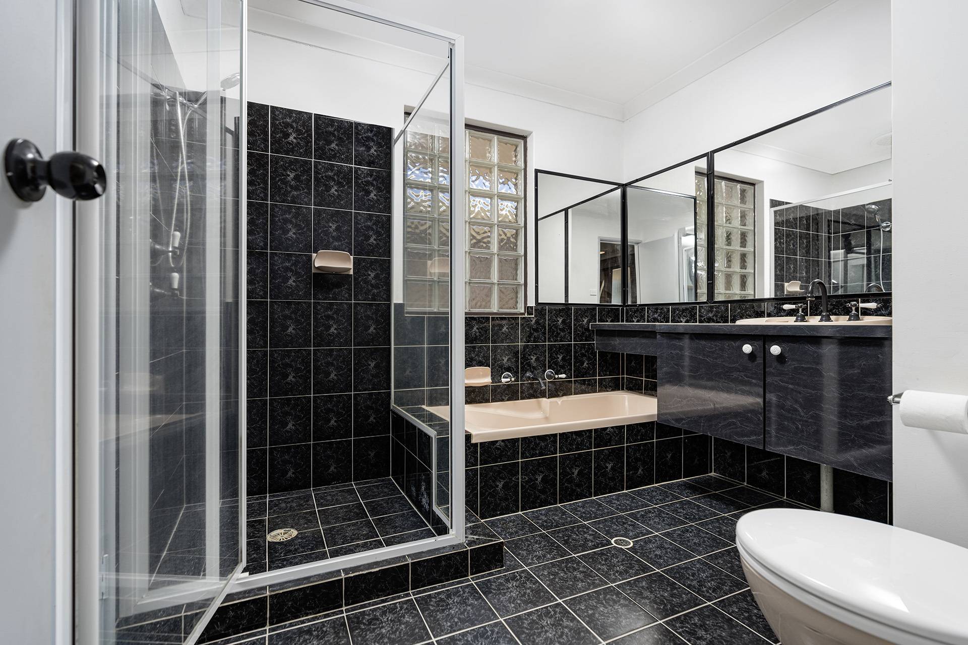 The stylish, yet practical, bathroom comprises of a shower, a separate bathtub, a toilet and a powder vanity. The separate laundry has over-head storage cupboards and benefits from external access, for drying.
