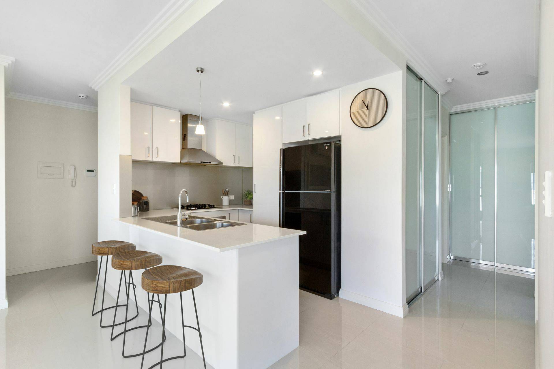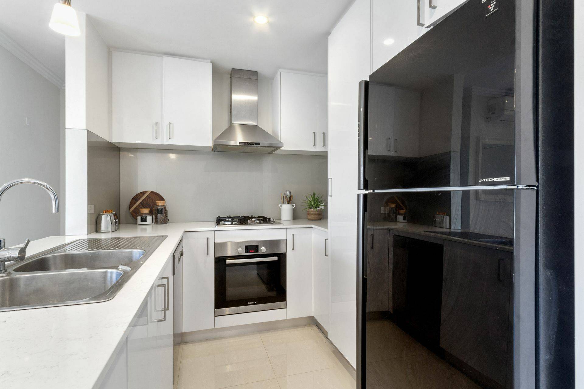 The only property in the development to have its own private access gate at the bottom of the staircase, this sleek abode is super-secure and enjoys a pleasant tree-lined vista from the tiled entertaining balcony. The outdoor area seamlessly connects to a central hub of an open-plan living, dining and kitchen area where split-system air-conditioning meets sparkling stone bench tops, double sinks, glass splashbacks and excellent Bosch range-hood, gas-cooktop, oven and dishwasher appliances.