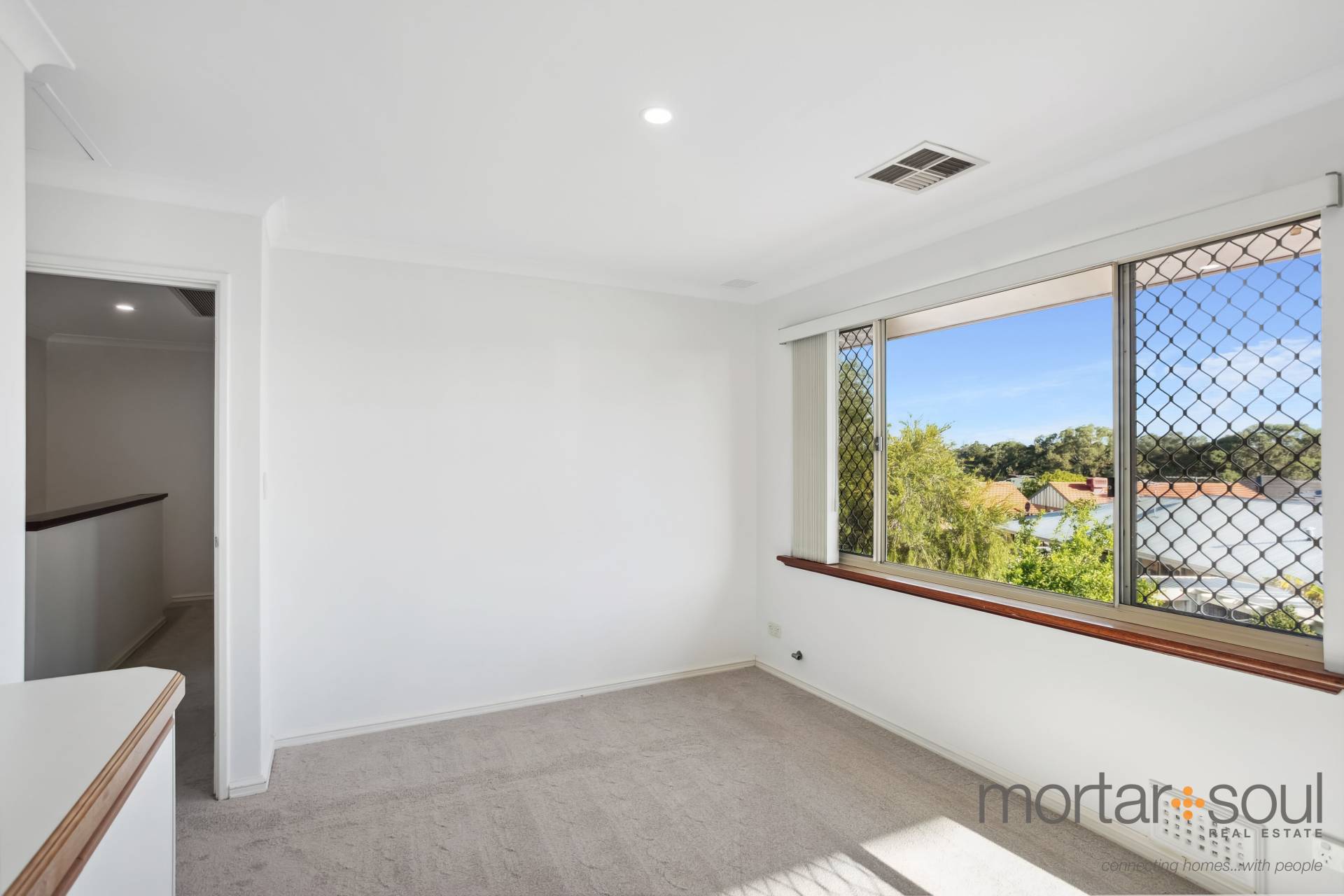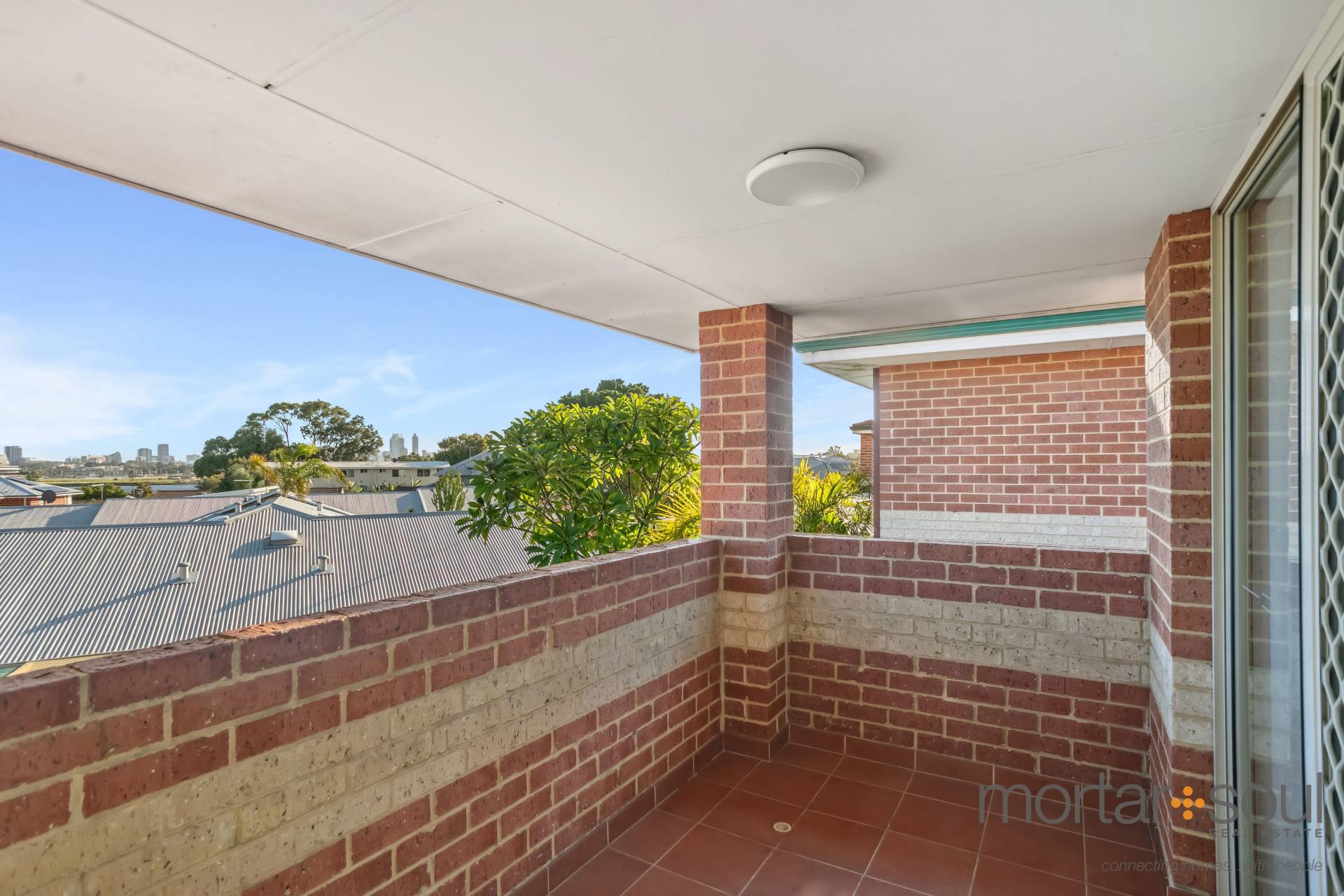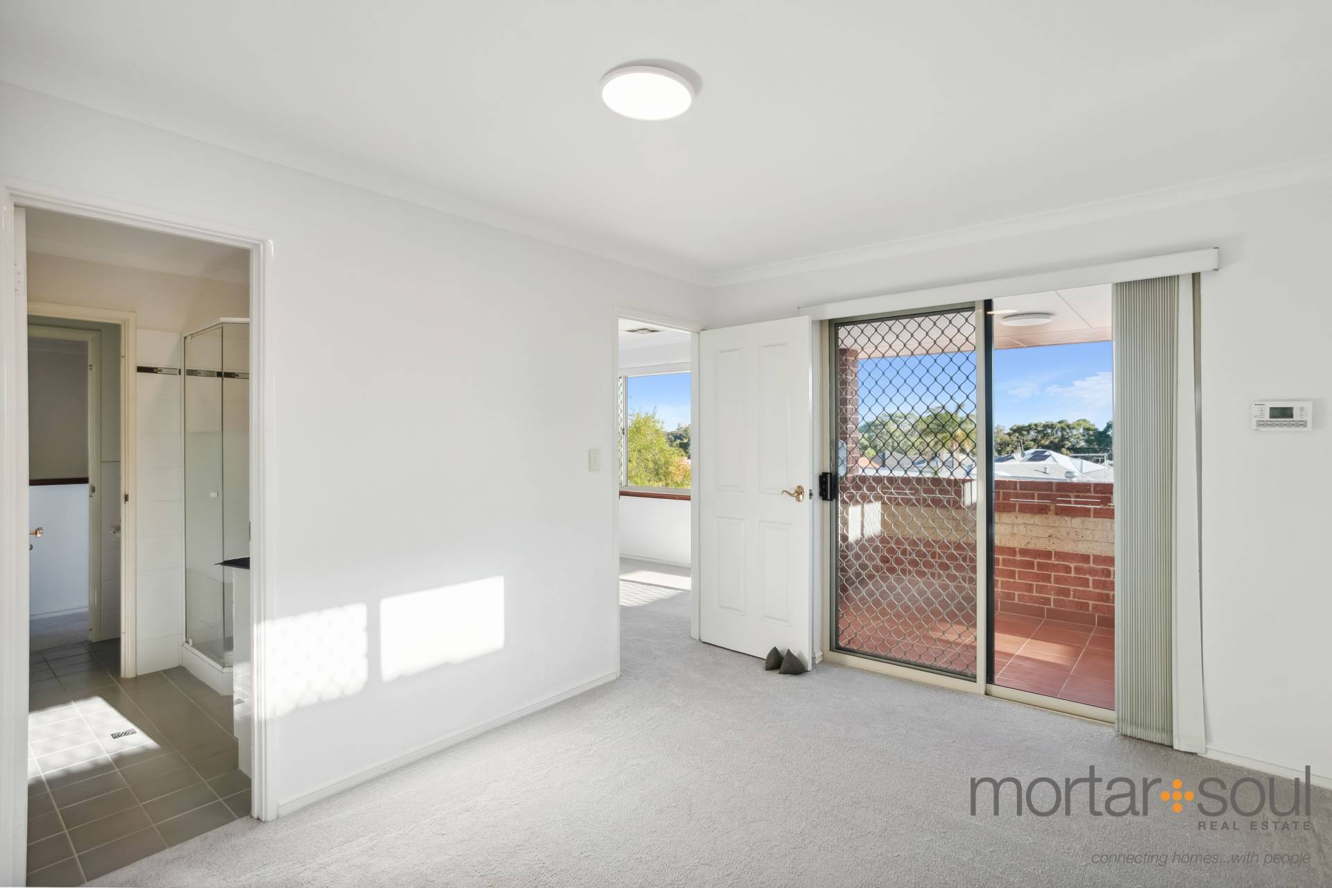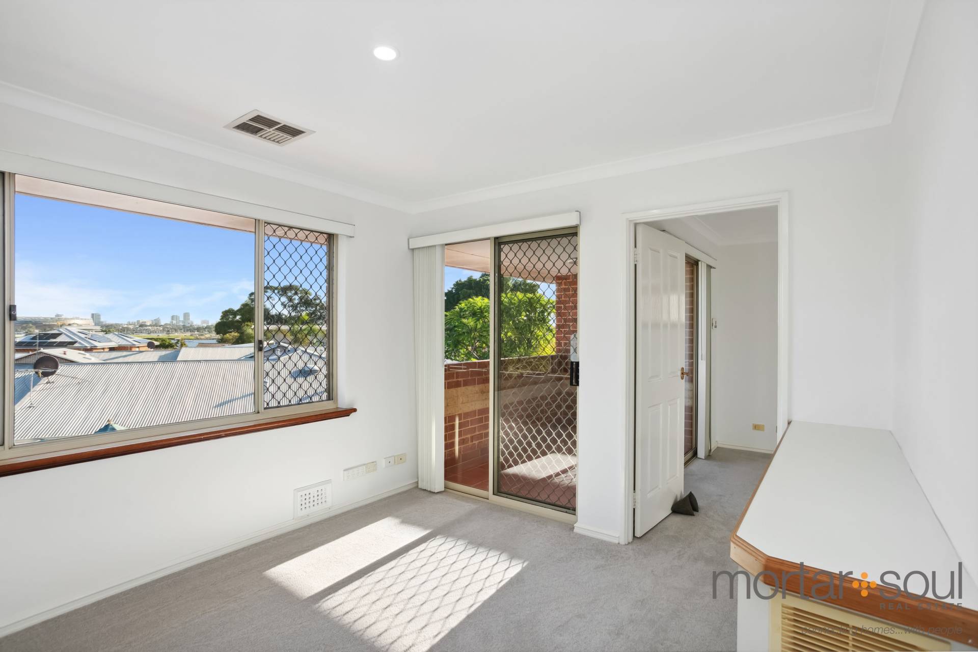 Upstairs, stunning city-skyline and Optus Stadium views from the most delightful of covered balconies is simply an added bonus. The sweeping vista is also prevalent from within the connecting retreat, that has its own gas bayonet for winter heating. A sleek white main bathroom caters for everybody’s personal needs in the form of a shower and separate bath, whilst the master suite is the obvious pick of the bedrooms – complete with direct balcony access, mirrored sliding doors compliment the built-in wardrobe, finished with an intimate ensuite with shower, vanity and toilet access.