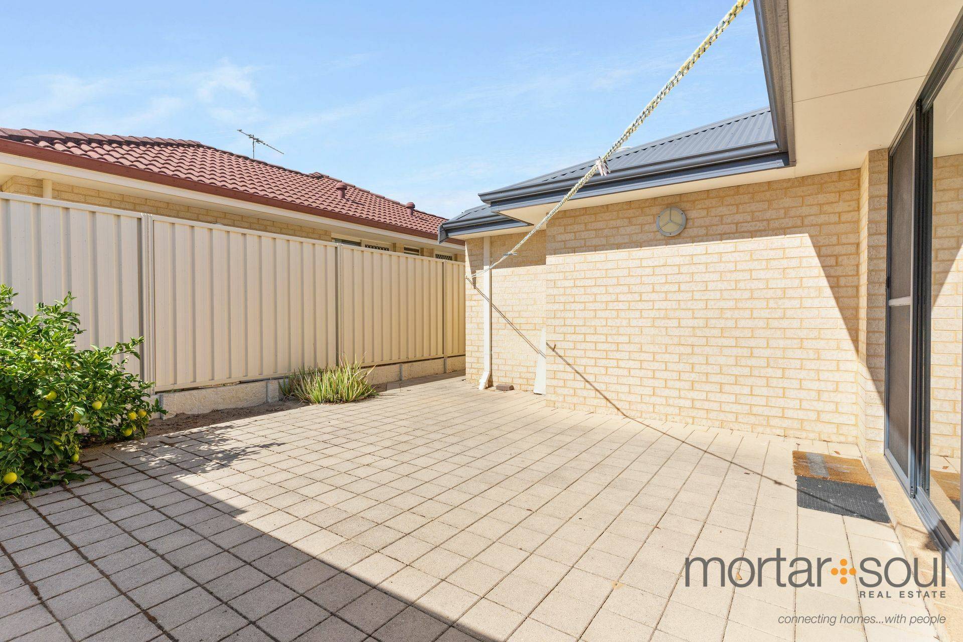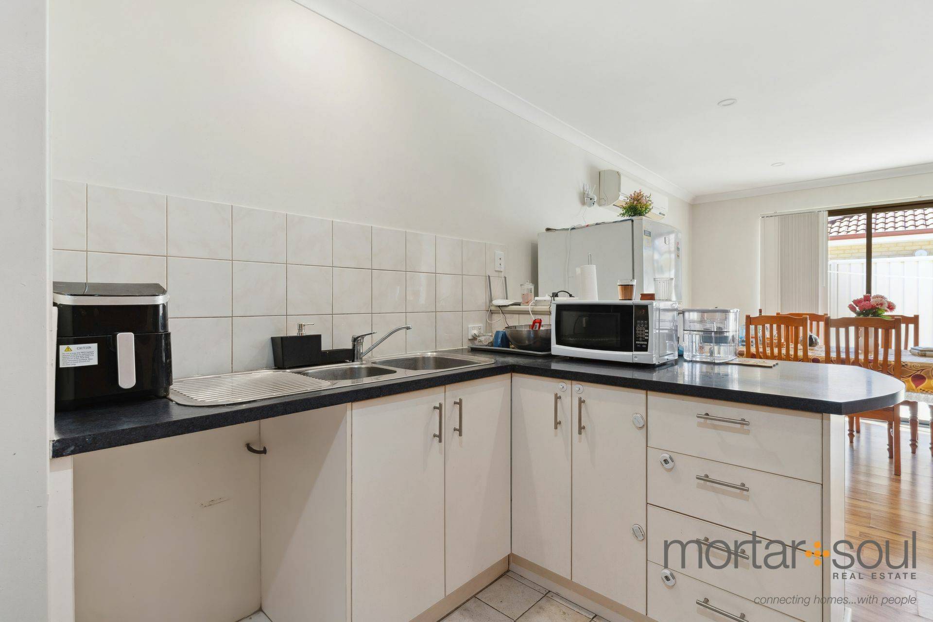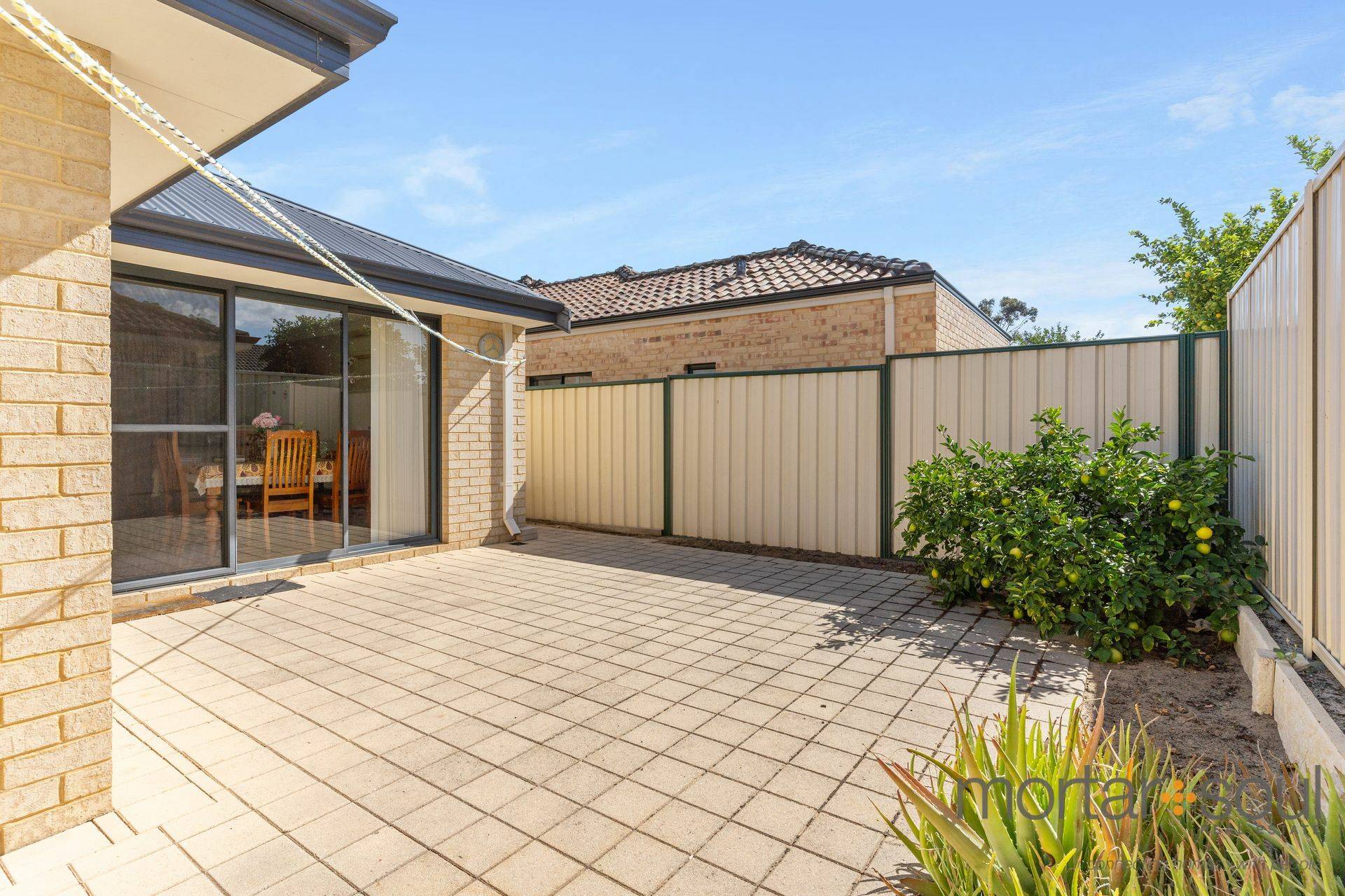 The open-plan living, dining and kitchen area doubles as your spacious hub of the floor plan, playing host to built-in storage pantry, double sinks, tiled splashbacks, modern stainless-steel range-hood, gas-cooktop and under-bench-oven appliances and a dishwasher recess. The zone also seamlessly extends outdoors to a delightful north-facing paved courtyard that encourages secluded low-maintenance entertaining, accompanied by a splendid fruit tree in the garden.