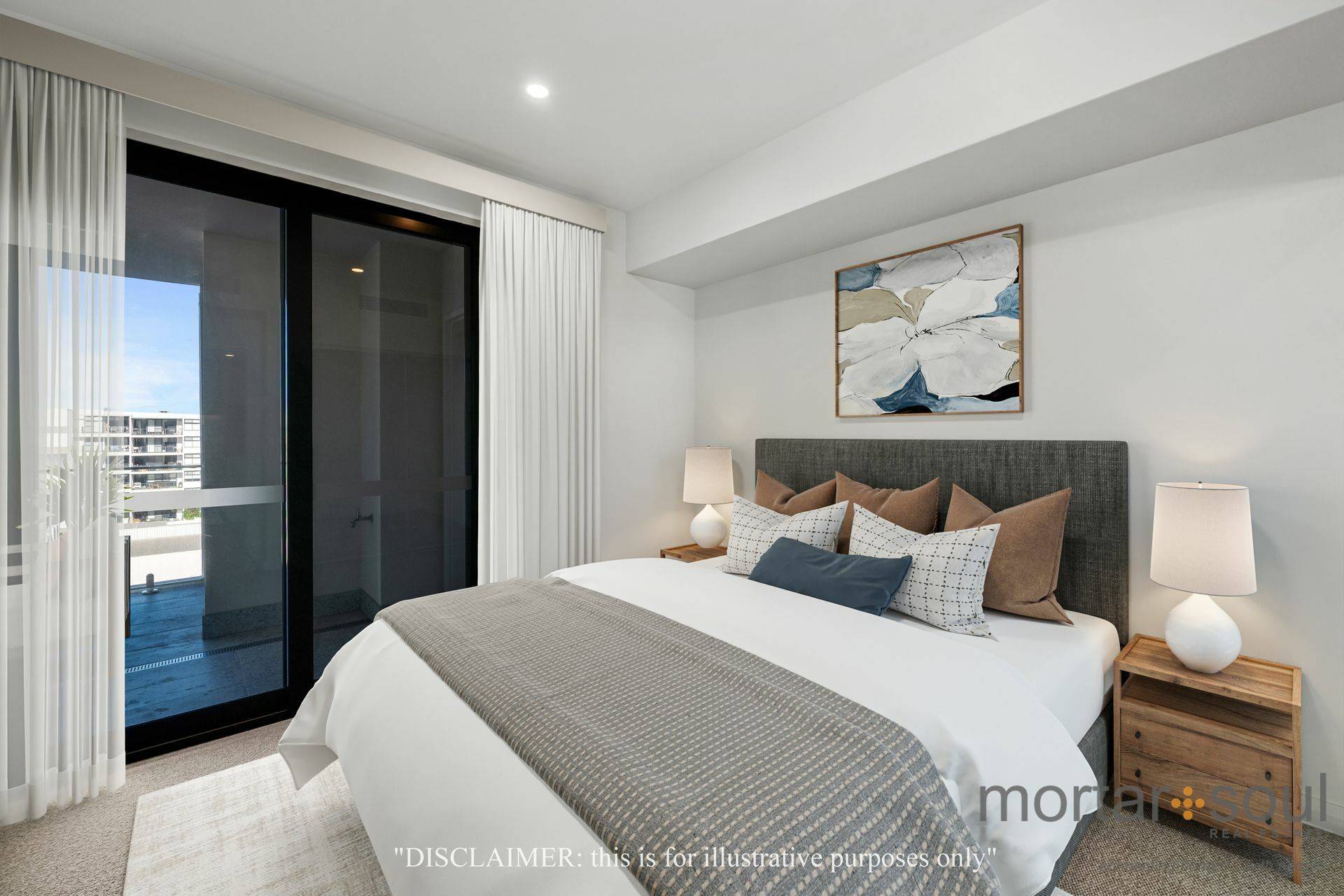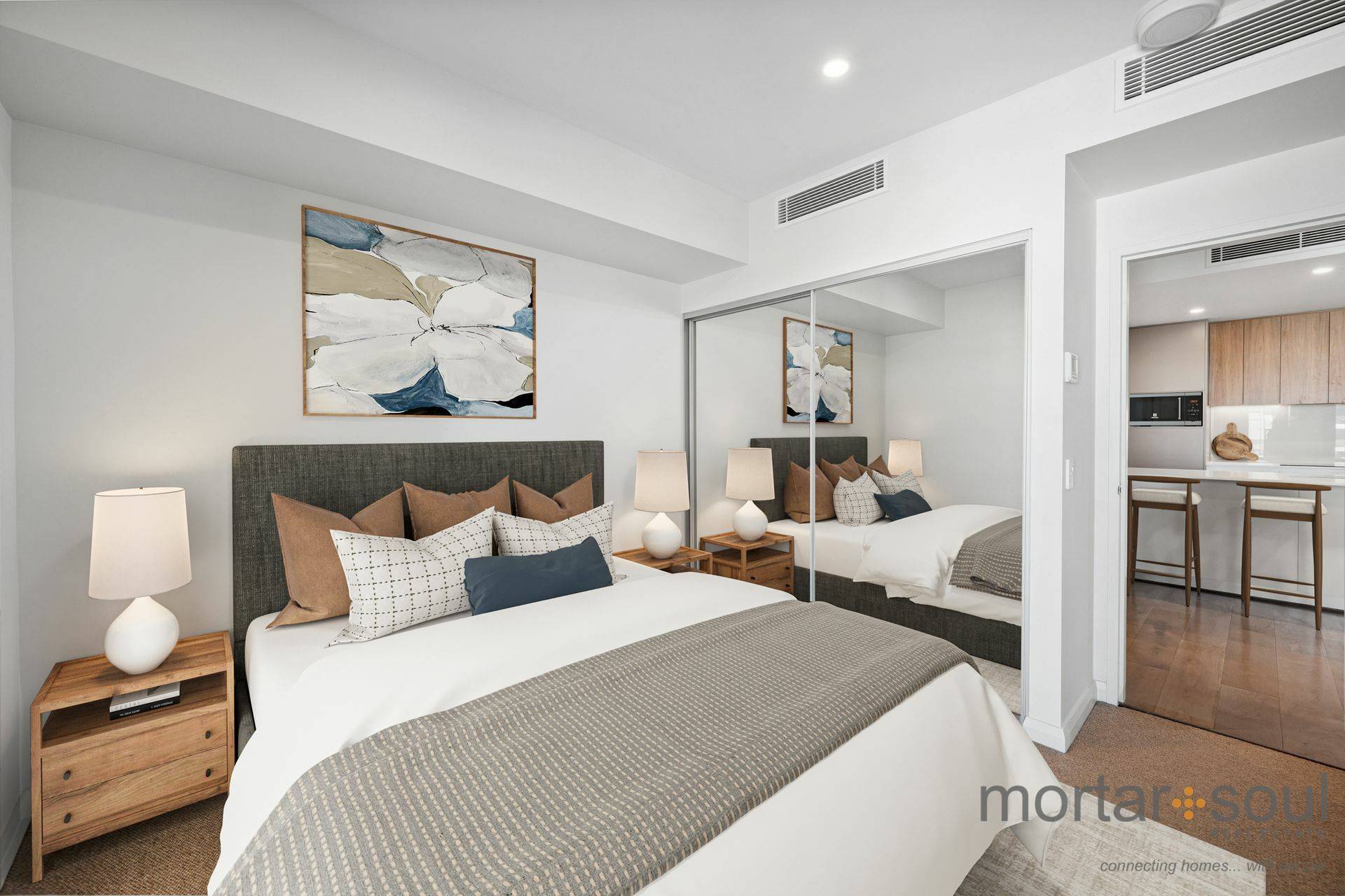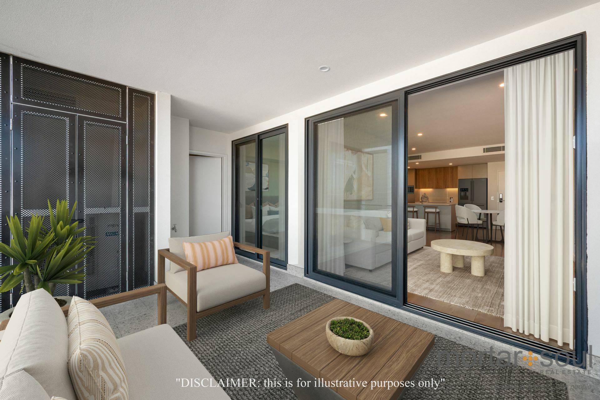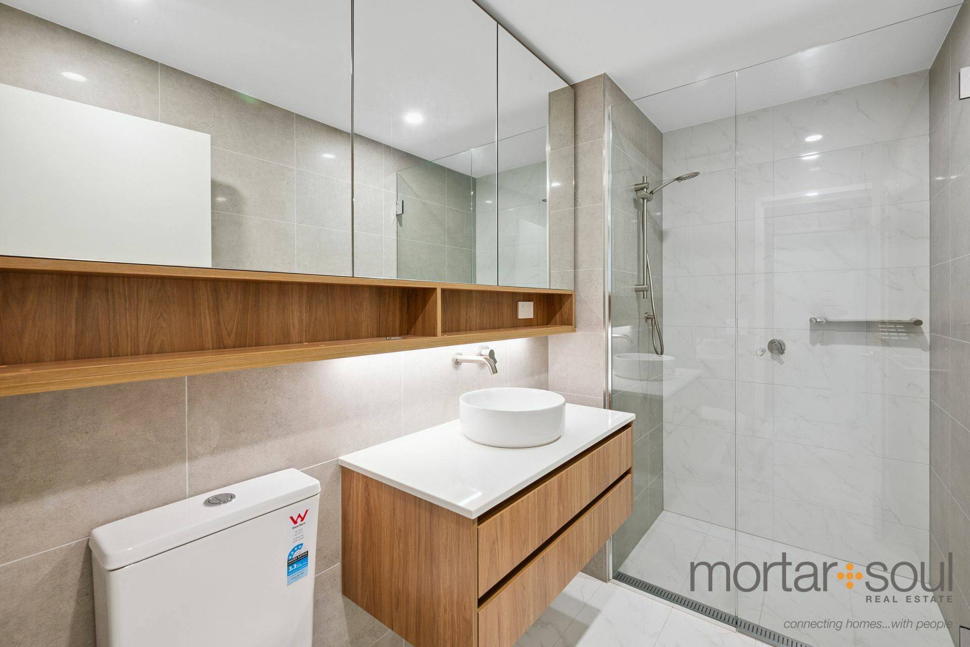 The carpeted bedroom is fitted with mirrored built-in wardrobes and enjoys its own direct balcony access, for peace of mind. A functional fully-tiled wet area is made up of a laundry, leading into a sleek and separate bathroom with a toilet, stone vanity and shower.