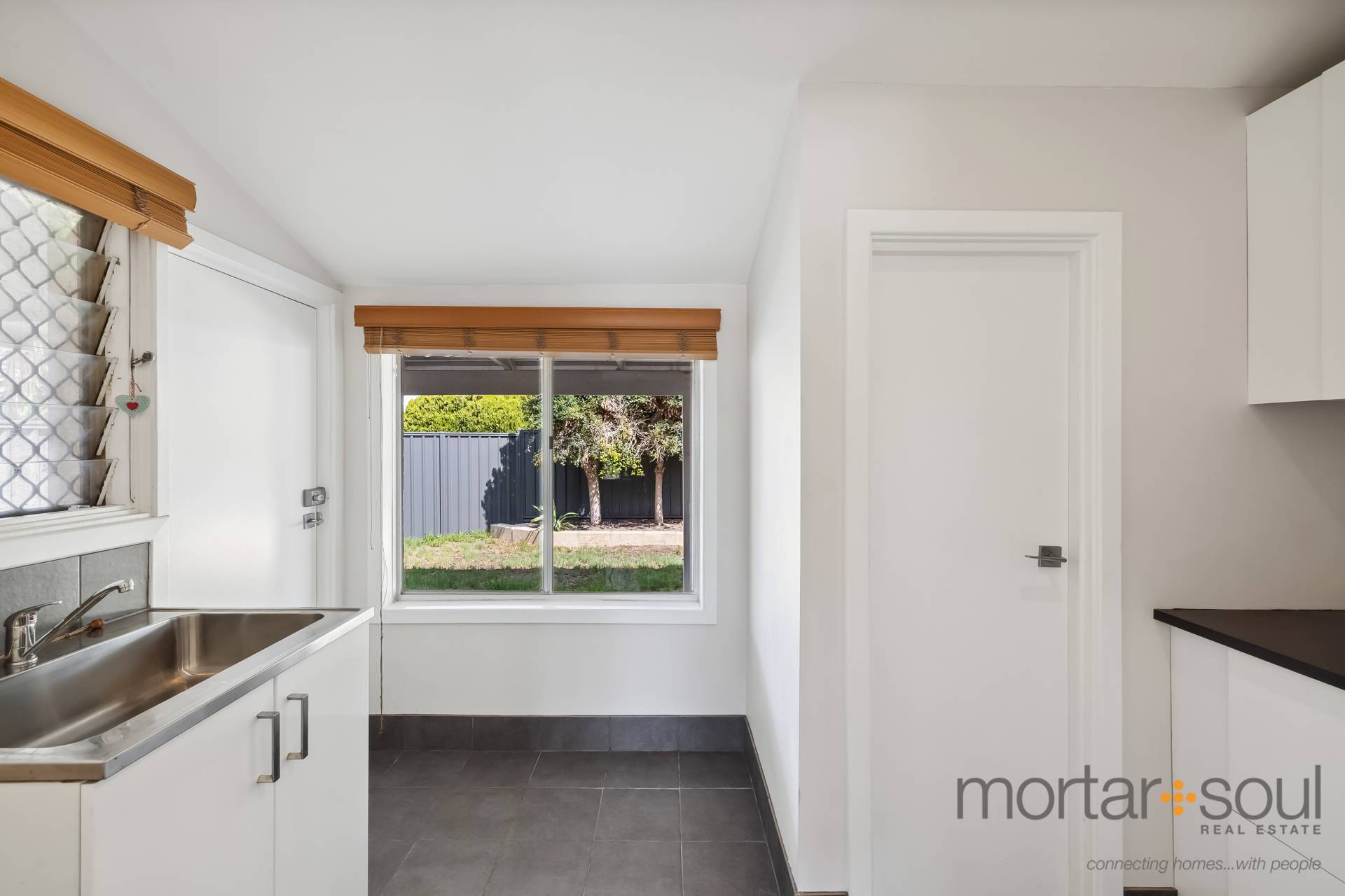 The laundry is a good size and plays host to linen storage, a separate toilet and an access door leading out to the side porch. Brilliant in its simplicity is a practical fully-tiled bathroom with shower, a separate bathtub and vanity.