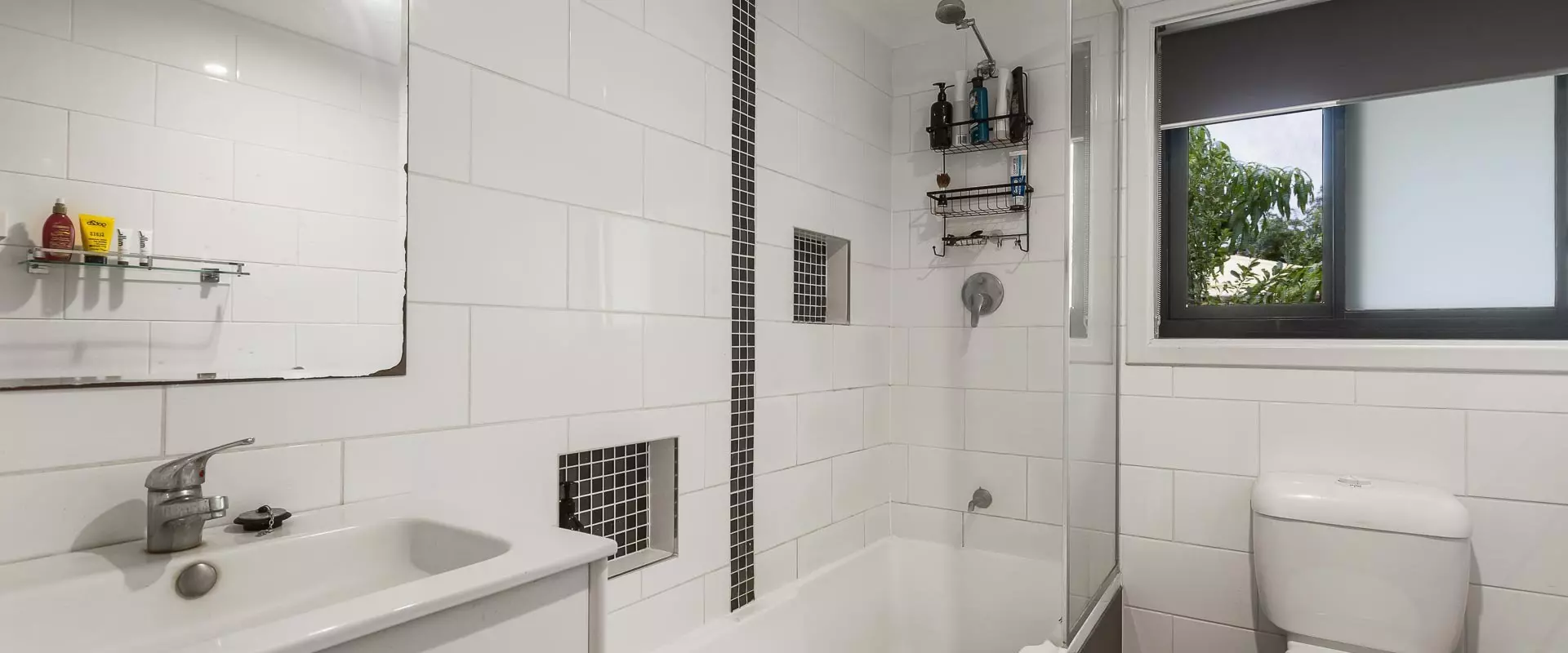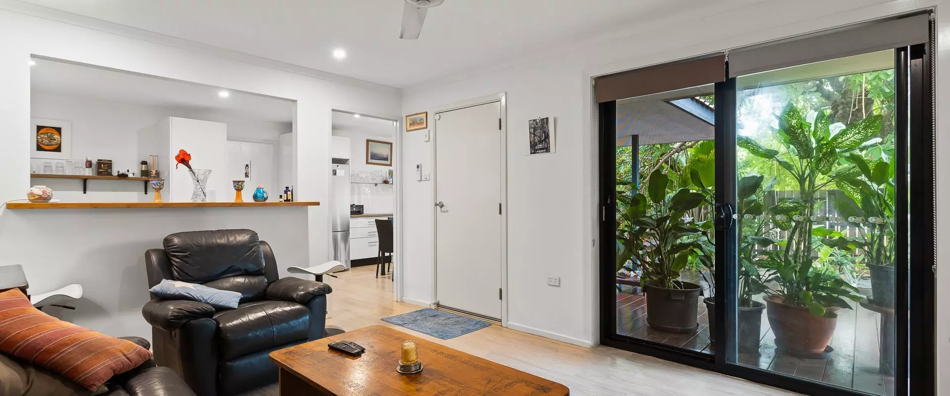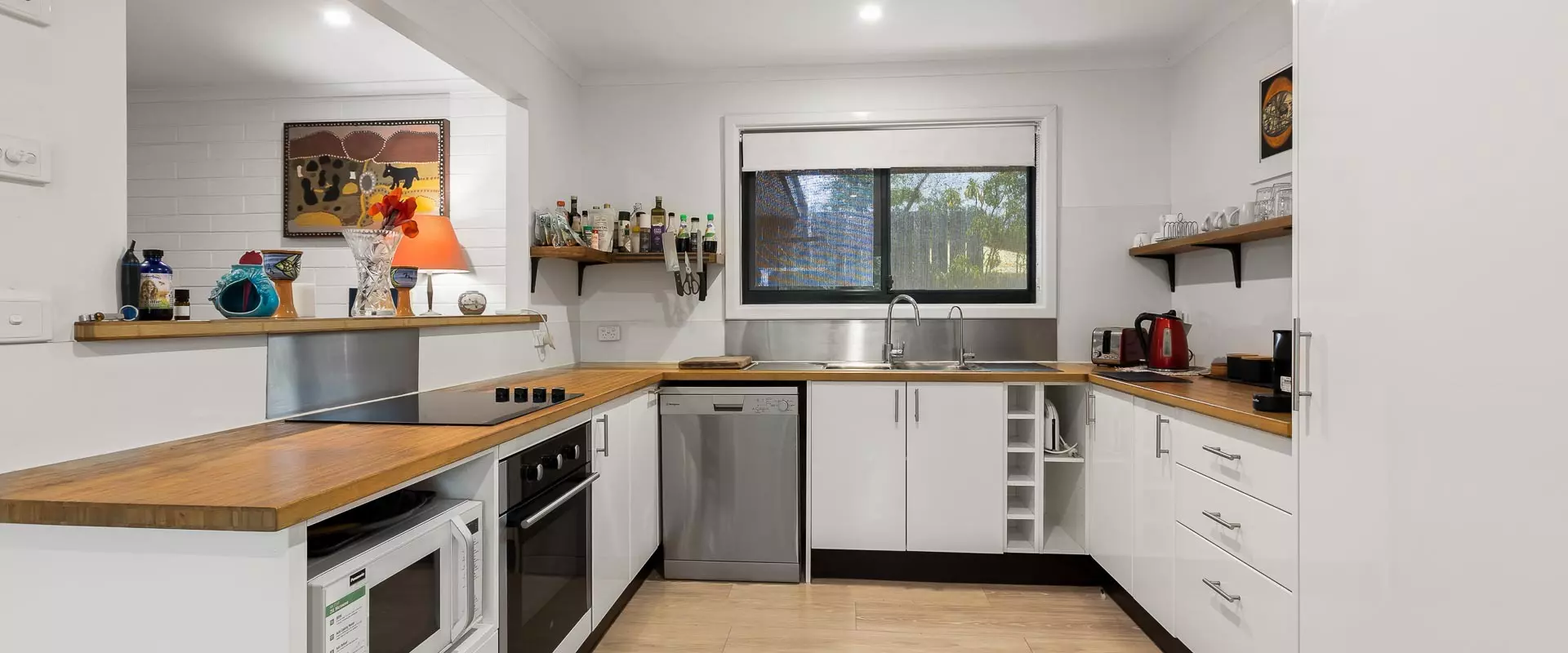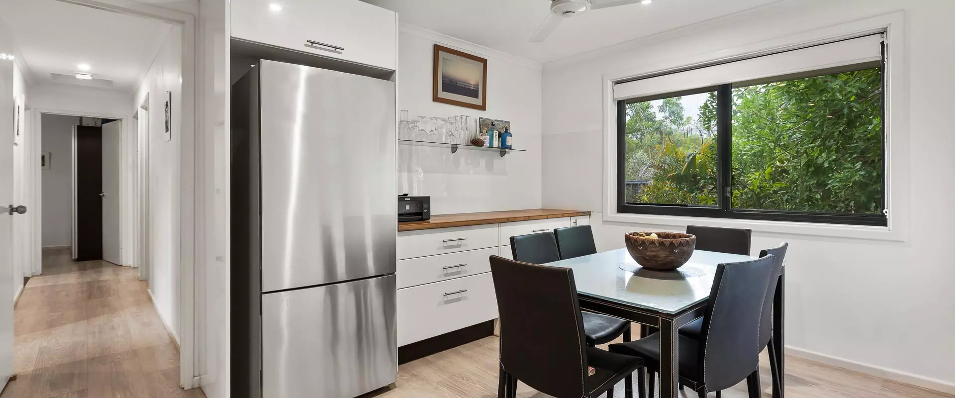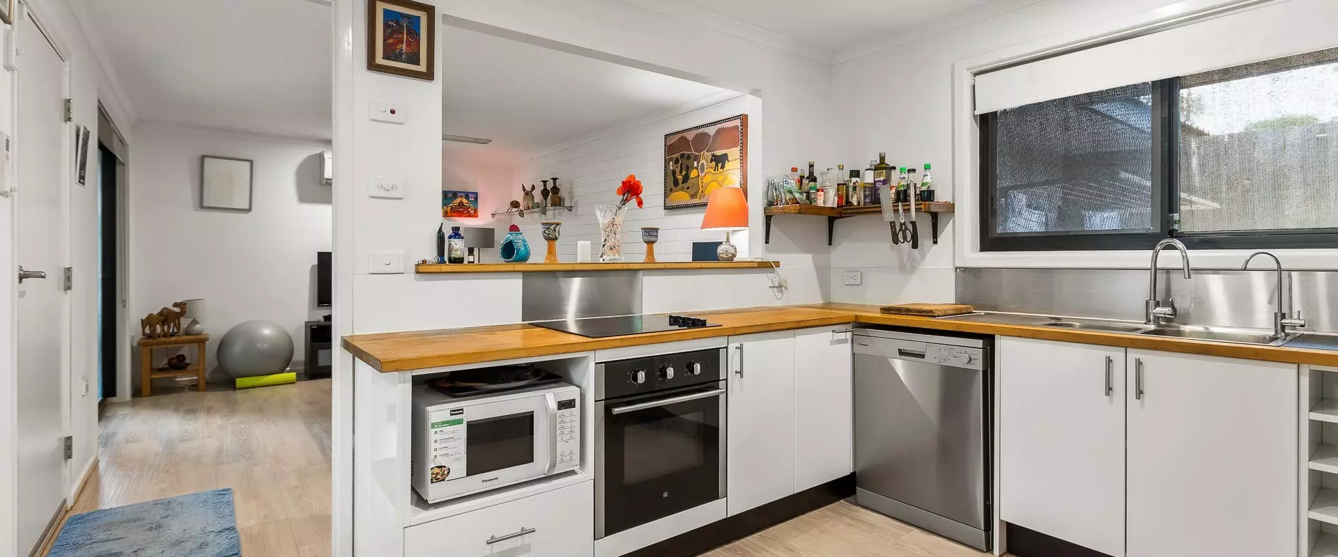 Welcoming you inside is a spacious living room that also forms part of a functional open-plan dining and kitchen area with a stainless-steel dishwasher, electric hotplate and oven appliances, a microwave nook, wine racking and more. All three bedrooms are more than generous in their proportions and boast built-in wardrobes, whilst the fully-tiled and revamped bathroom is brilliant in its simplicity and plays host to a bathtub, showerhead, powder vanity and toilet.
