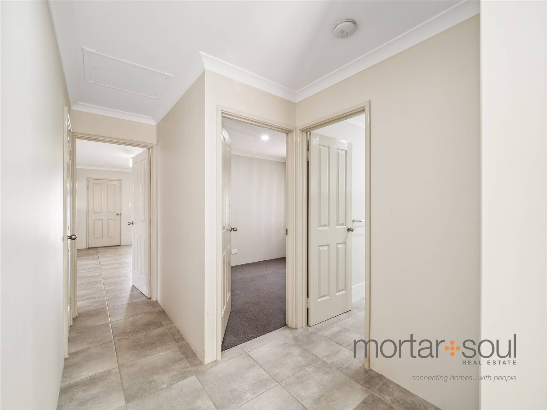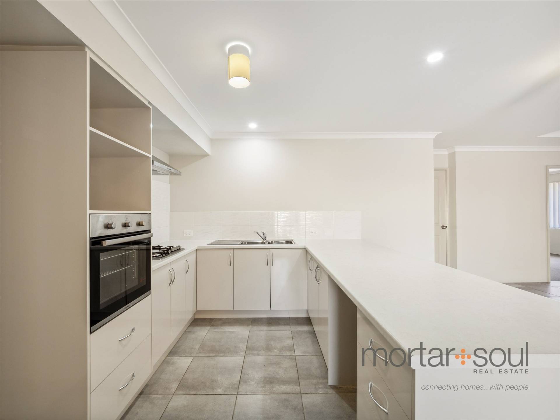 A welcoming front living room leads through to the open-plan dining and kitchen area, where a sense of flow and practicality is complemented by a breakfast bar, a corner storage pantry, double sinks, a microwave nook and excellent stainless-steel range-hood, gas-hotplate and under-bench-oven appliances.