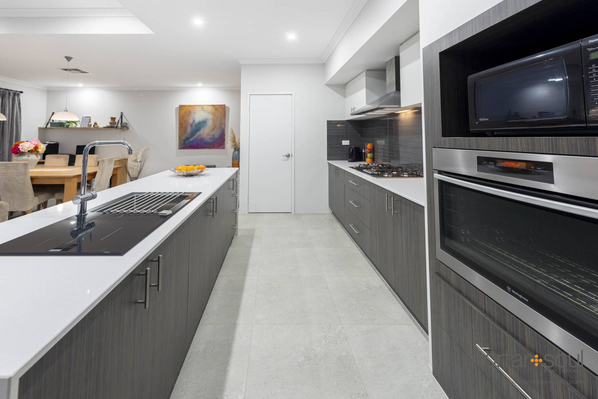 • Deluxe chef’s dream of a kitchen with 900mm-wide gas-cooktop and range-hood appliances, a separate oven, a stainless-steel dishwasher, fridge water and ice plumbing, a designer glass sink, ample storage and double door sliding pantries to scullery - with second sink and preparation area featuring a decorative barn door