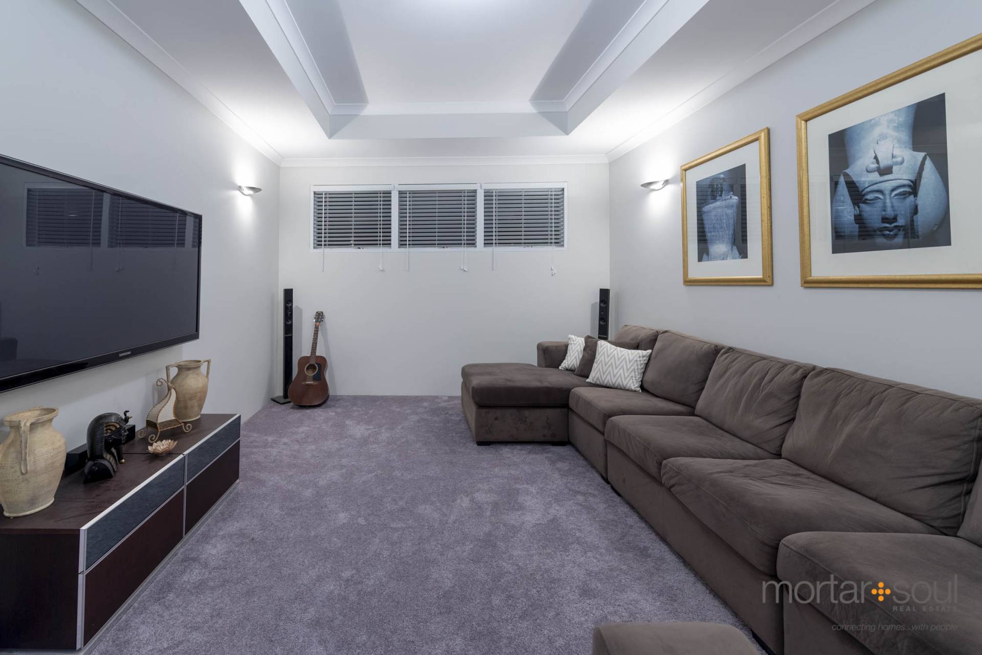 The combined open-plan living, dining, games and kitchen area is huge and enjoys a seamless indoor-outdoor integration with the fabulous rear alfresco that is brilliant in its privacy and boasts a fully-tiled built-in kitchen of its own – plus a stainless-steel barbecue and bench seating for your guests. There is also a built-in bar to the games area, an exquisite scullery linking the kitchen with the laundry and a dream home-theatre room that is carpeted for comfort and essentially triples the amount of personal living options on offer to you here.