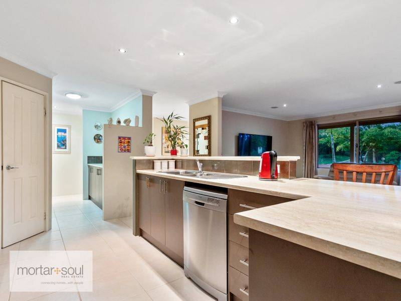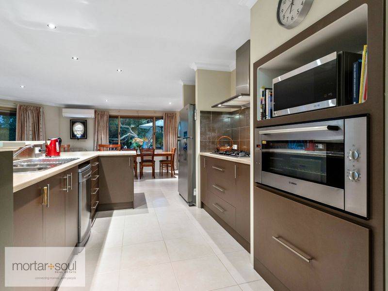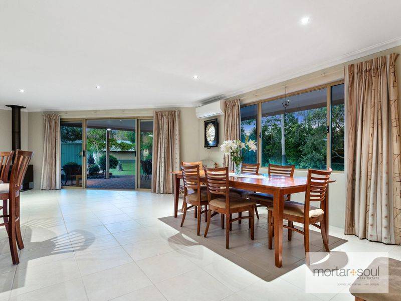 No matter where you stand on the acreage, there are scenic views on offer – none more prevalent than the leafy aspect that graces you when sitting out under a paved wraparound L-shaped alfresco verandah, overlooking lush green lawns, shady trees and the likes of galahs, parrots and more. At the rear of the house, a shimmering blue swimming pool is elevated, leaves heaps of room to laze about in the sun and provides a picturesque backdrop to further entertaining underneath a fabulous poolside alfresco deck.