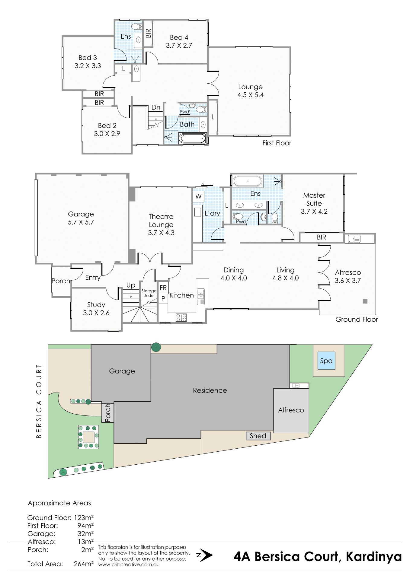 Another set of double French doors off the main living space seamlessly extends out to a fabulous lined alfresco-entertaining area with its own kitchenette and sink, as well as a private north-facing backyard featuring a bubbling outdoor spa – just the type of thing your guests will be impressed by. Also downstairs are a study (directly off the entry), fully-tiled powder-room and laundry wet areas, internal shopper’s access via the double garage and a light and bright master-bedroom suite where gleaming Bamboo floorboards and full-height mirrored built-in wardrobes meet a fully-tiled ensuite bathroom with a shower, spa bath, heat lamps, a separate toilet and twin “his and hers” vanities.