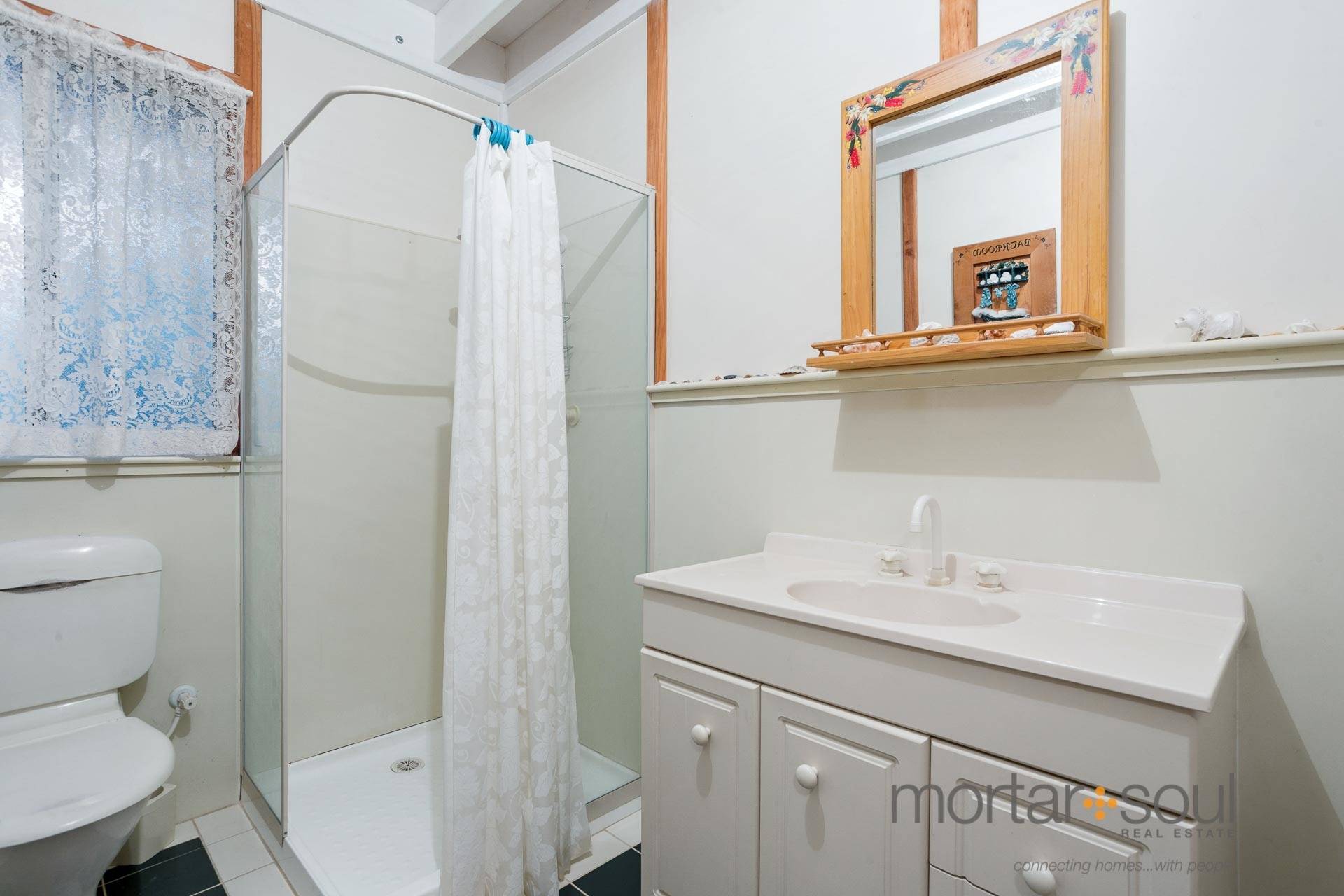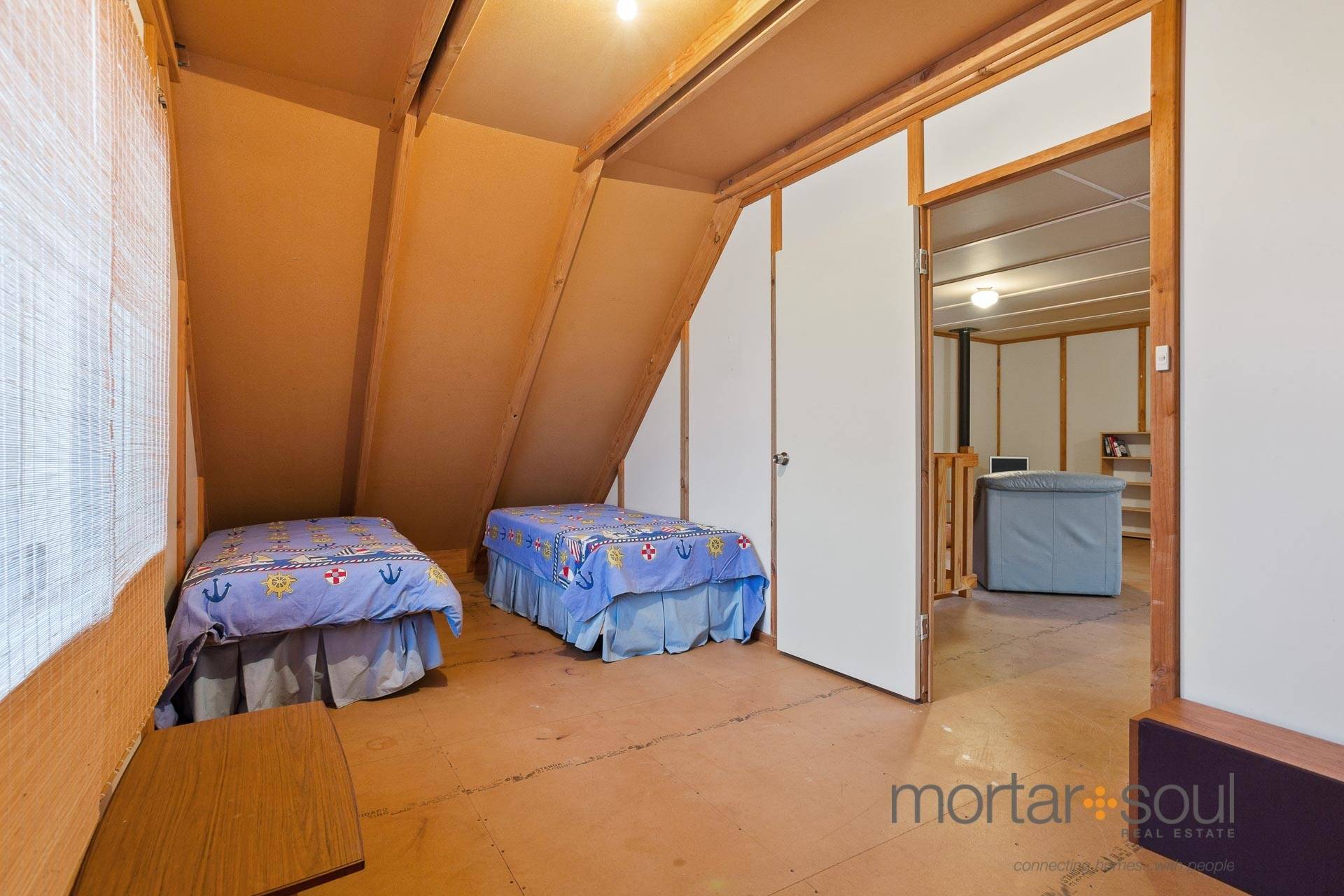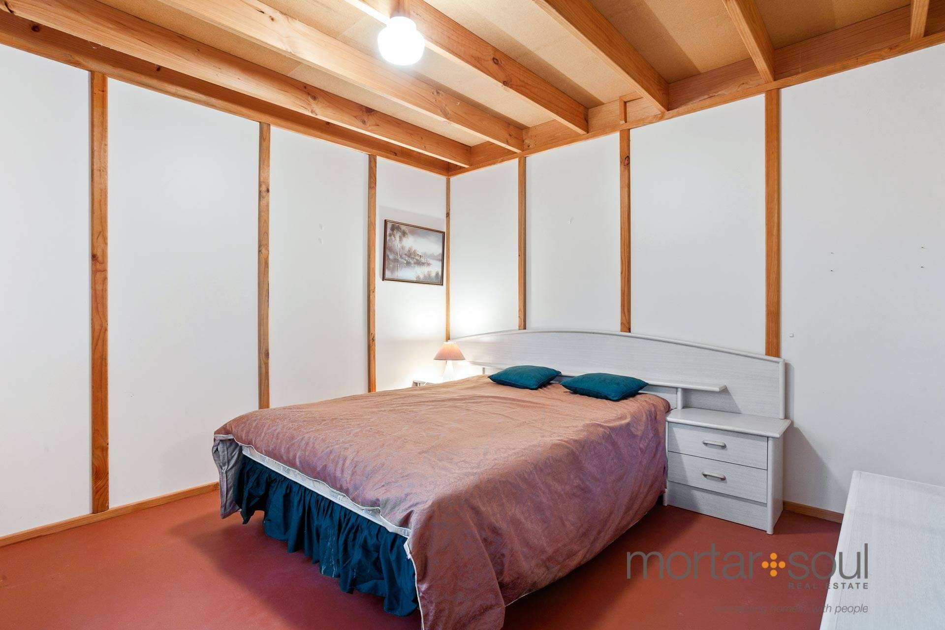 Downstairs, the second bedroom neighbours a practical laundry with a separate toilet and external access, whilst the main bedroom of similar proportions complements the bathroom next door to it – shower, toilet, vanity and all. Charming raked ceilings are a common theme throughout the ground floor, also gracing a spacious open-plan living, dining and kitchen area where most of your casual time will be spent – the latter part of the layout just off the entry and on the other side of the staircase boasting a corner pantry, double sinks, a sleek white electric-upright cooker and more.