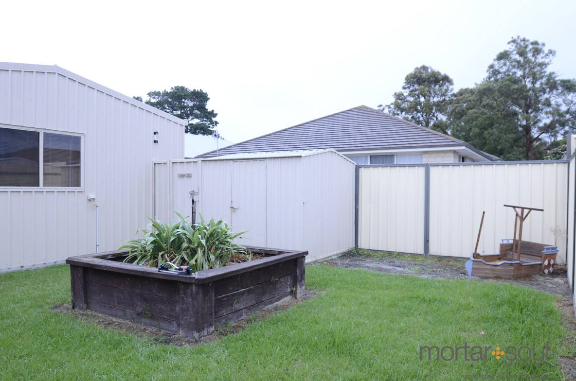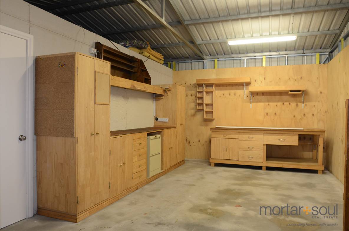The grassed easy-care backyard comes with a separate toolshed and workshop, complete with workbench and quality storage racking.